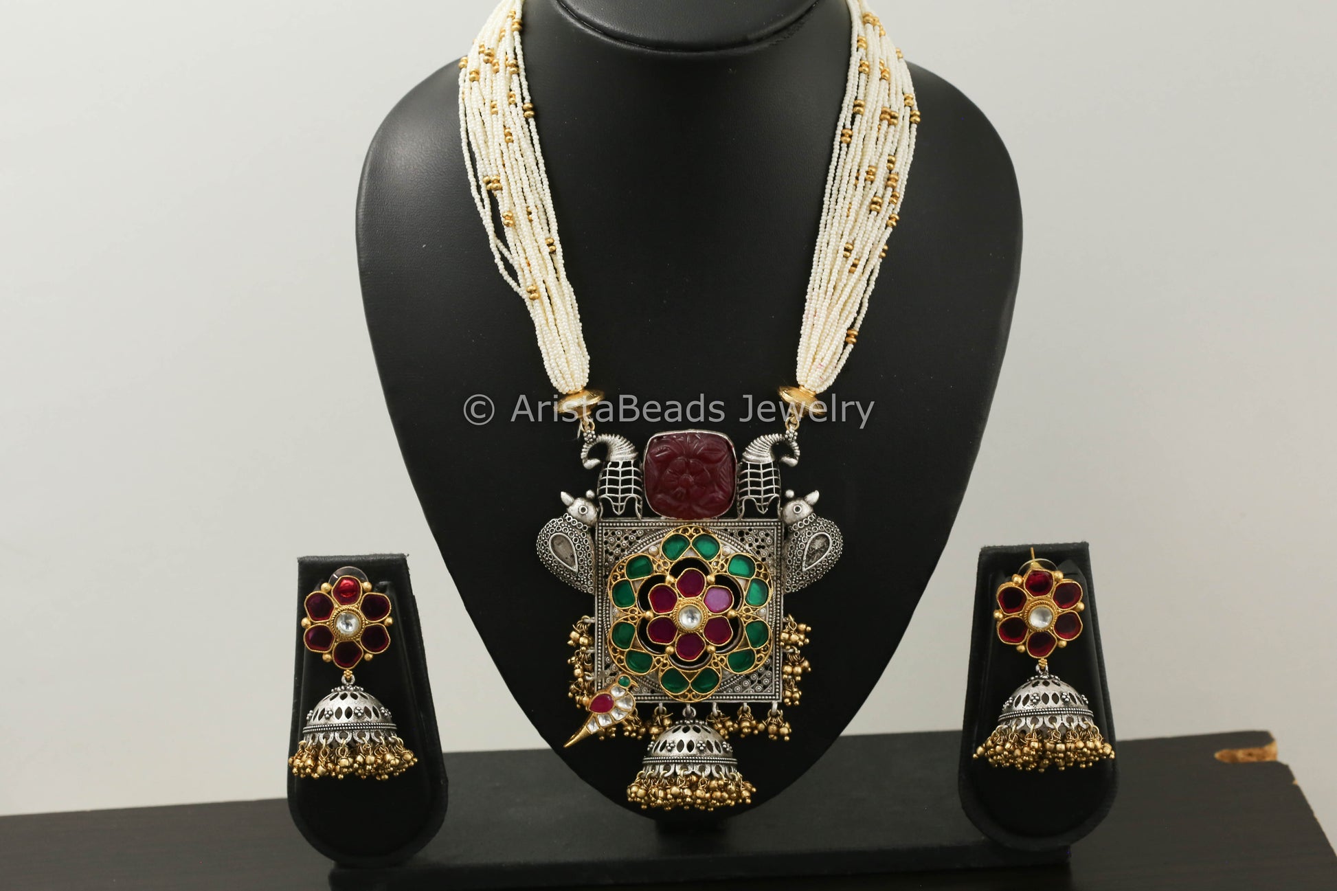 Dual Tone Pota Stone Kundan Necklace Set -Red Green