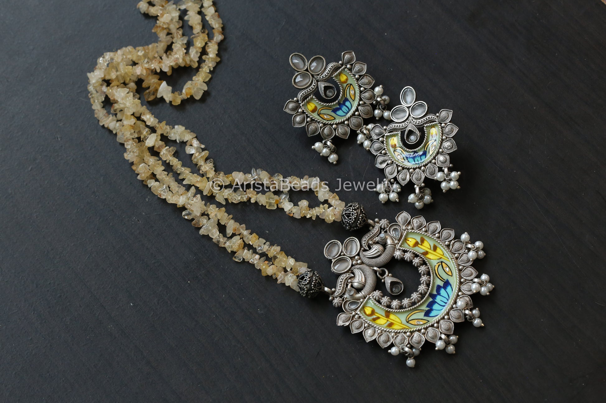 Enamel Oxidized Necklace Set - Citrine Beads Mala