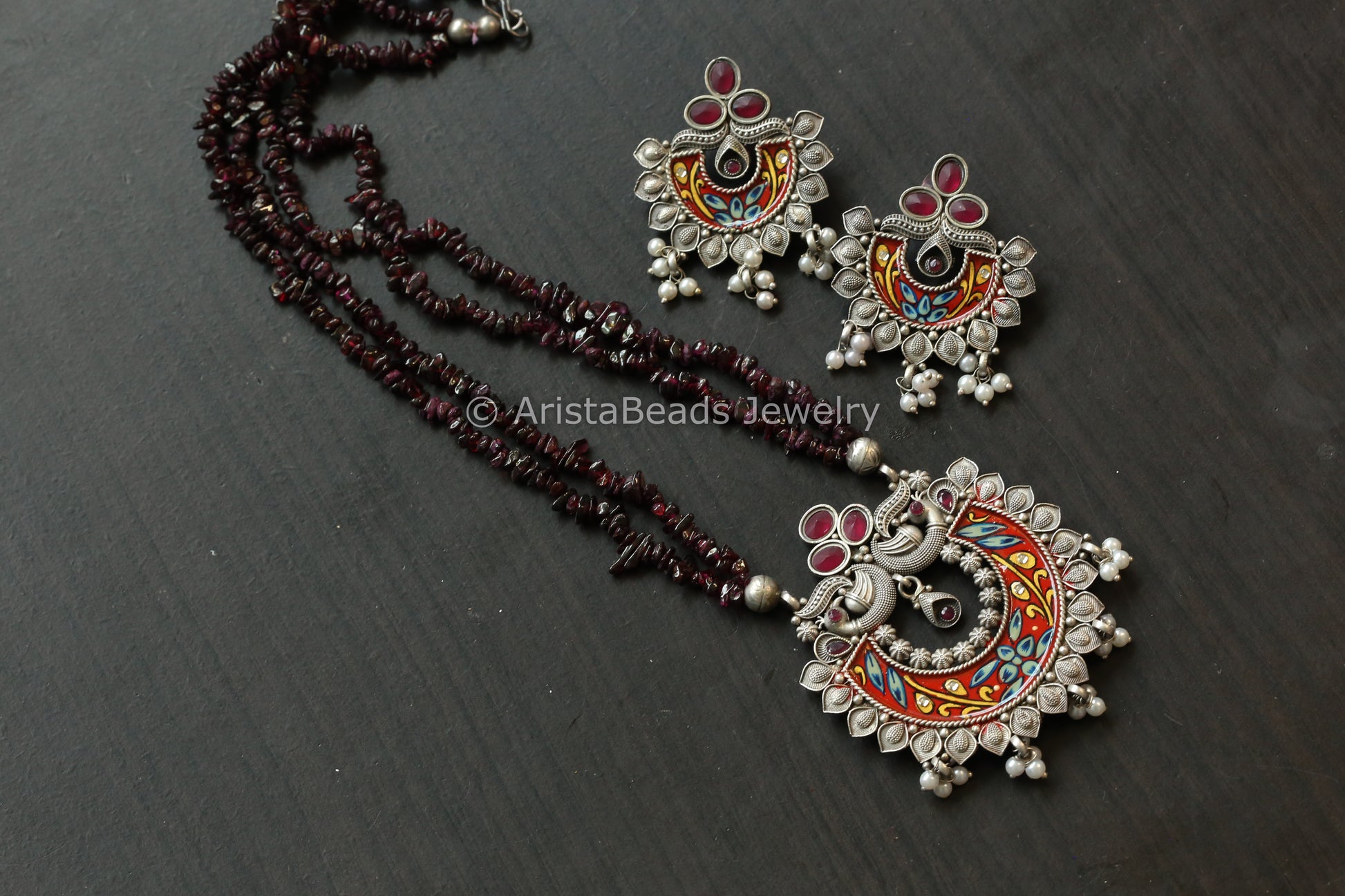 Enamel Oxidized Necklace Set - Garnet Beads Mala
