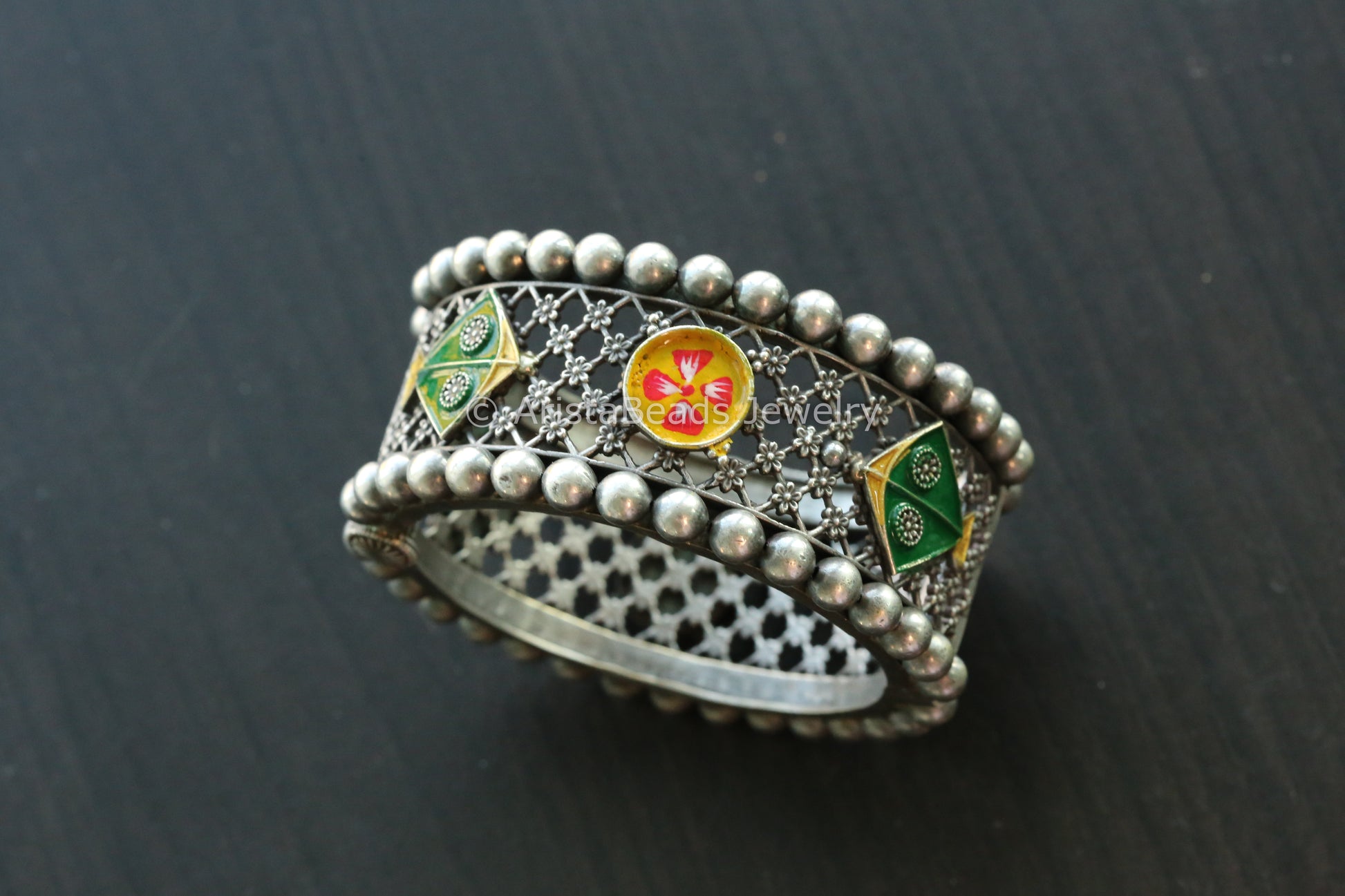 Enamel Oxidized Silver Look Bangle - Green Yellow