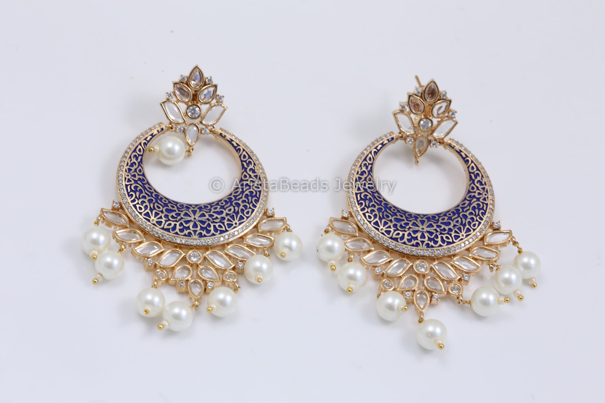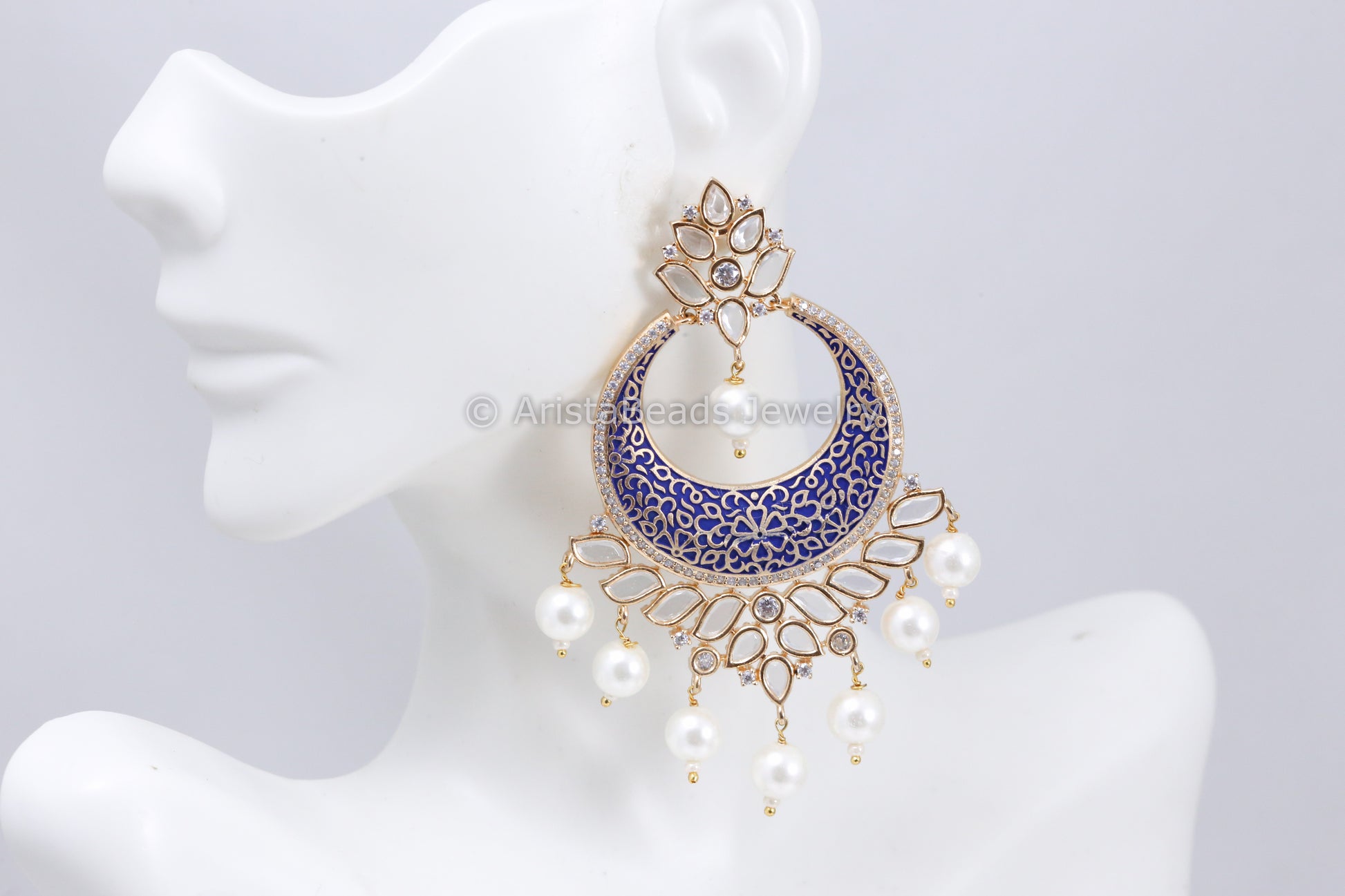 Contemporary golden polki chandbaali in blue enamel and pearl hangings.
