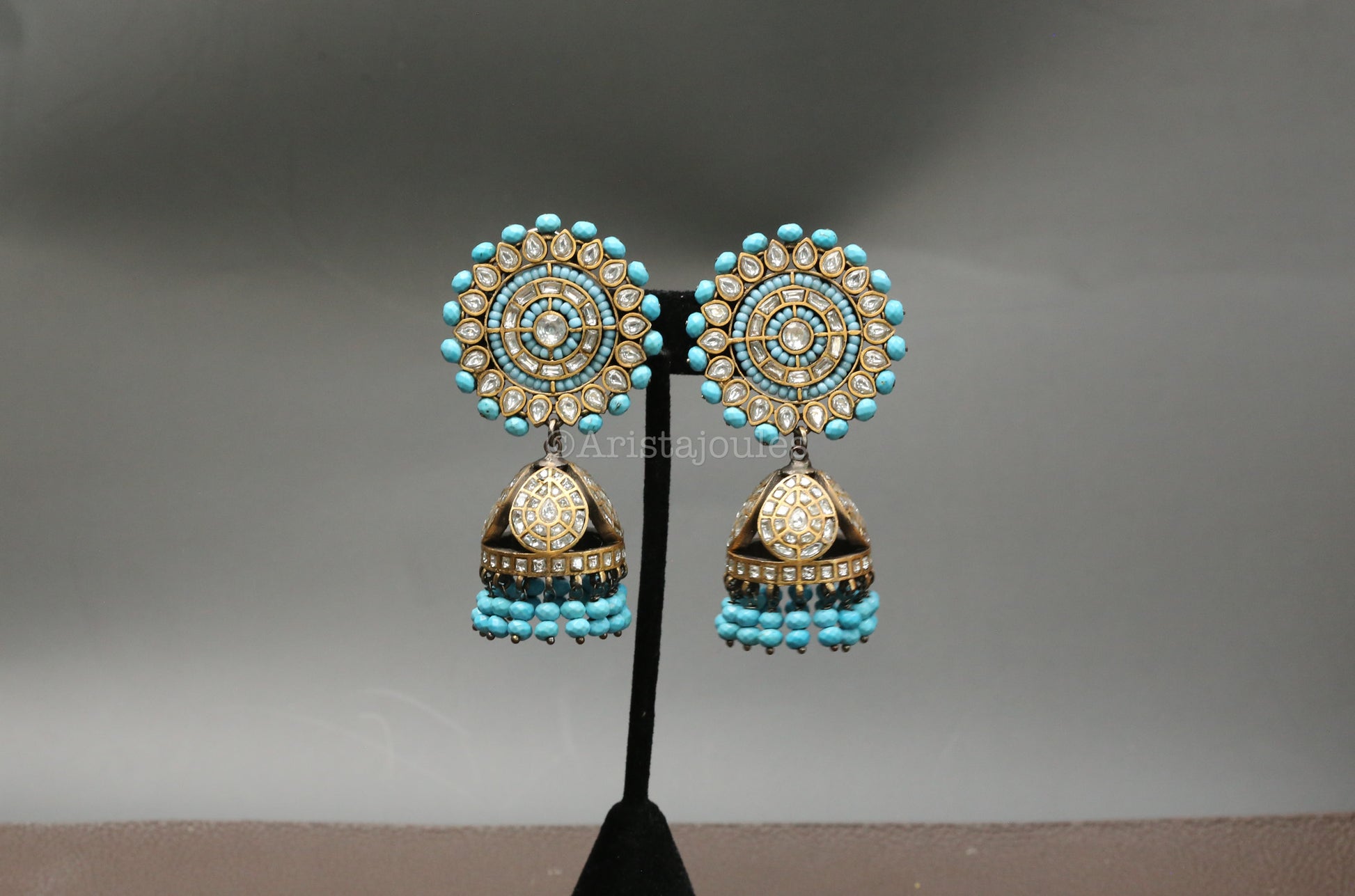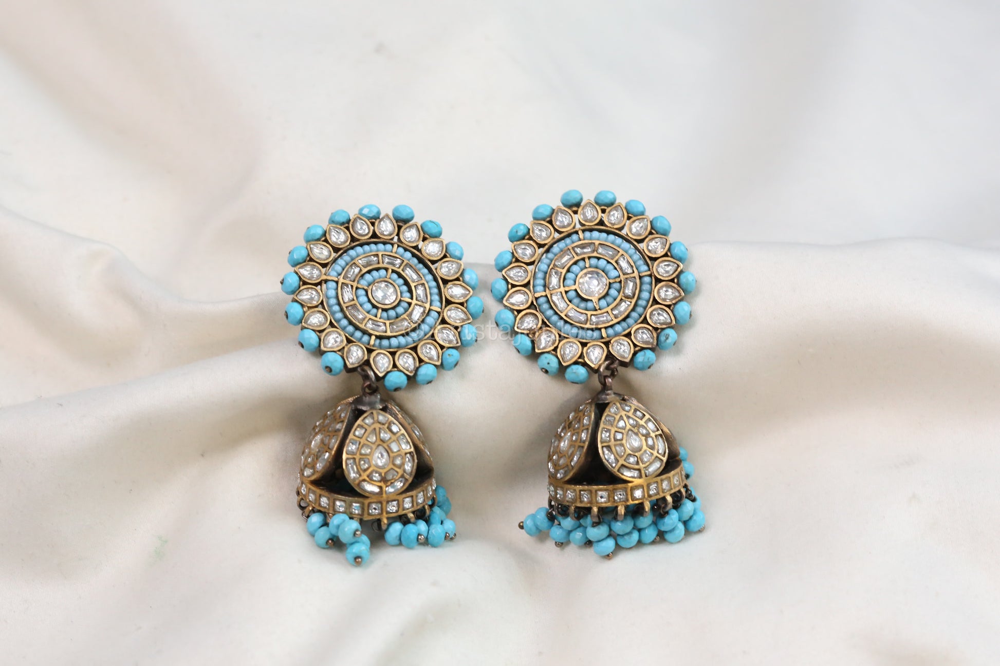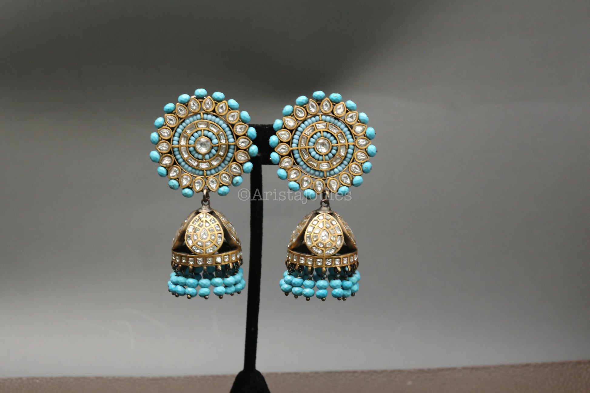 Timeless jhumka earrings featuring authentic turquoise beads, pearls and dual-tone vintage polish. A sophisticated blend of traditional craftsmanship and elegant design that elevates any collection.