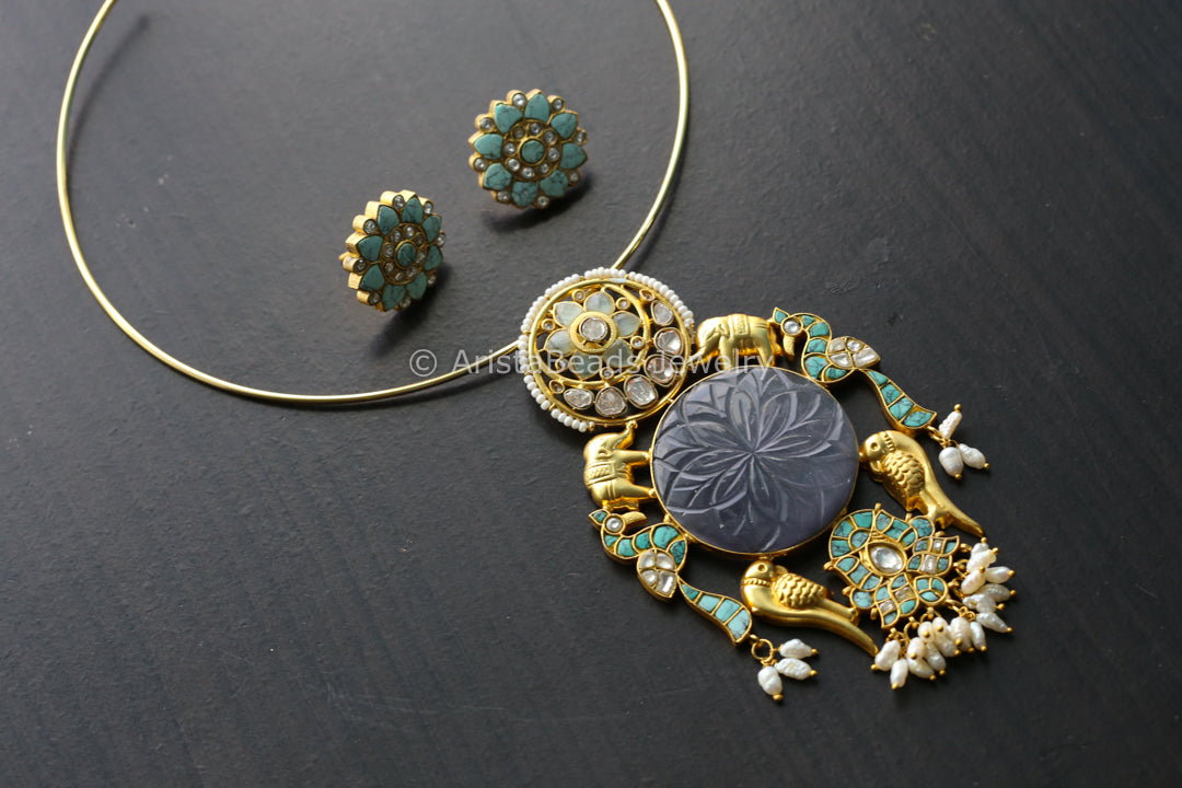 Fusion Jadau Kundan Pendant -Gray Carved Stone (Hasli Removable)