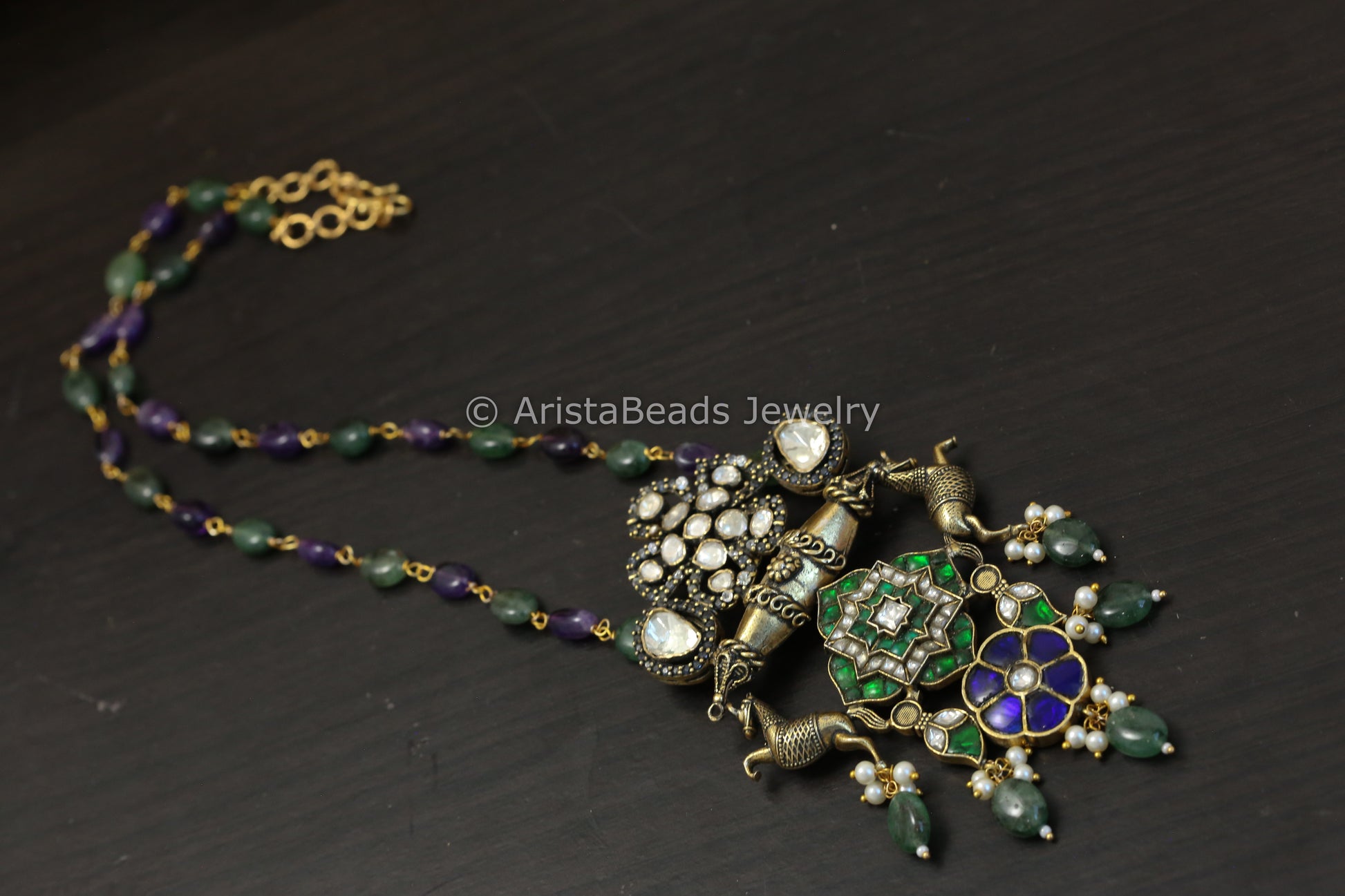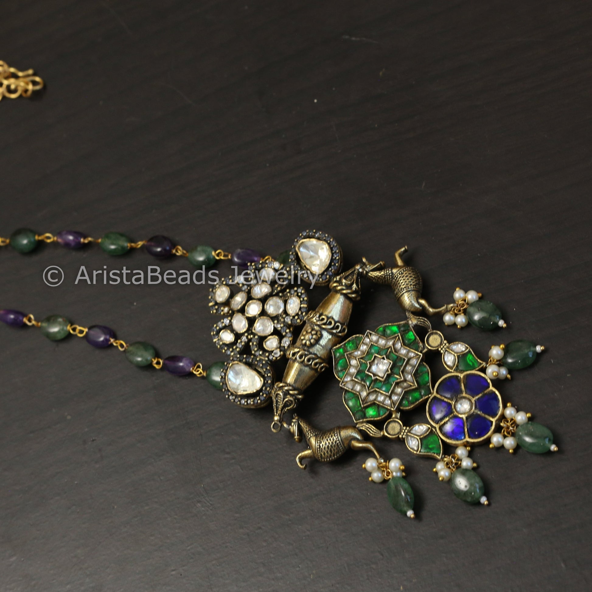 Explore the fusion of Jadau and Moissanite in this stunning necklace. Handcrafted with Aventurine and Amethyst beads, it exudes a luxurious appeal. Perfect for any occasion, this necklace adds elegance with its unique design. Trust in the expert craftsmanship and quality materials for a lasting statement piece.