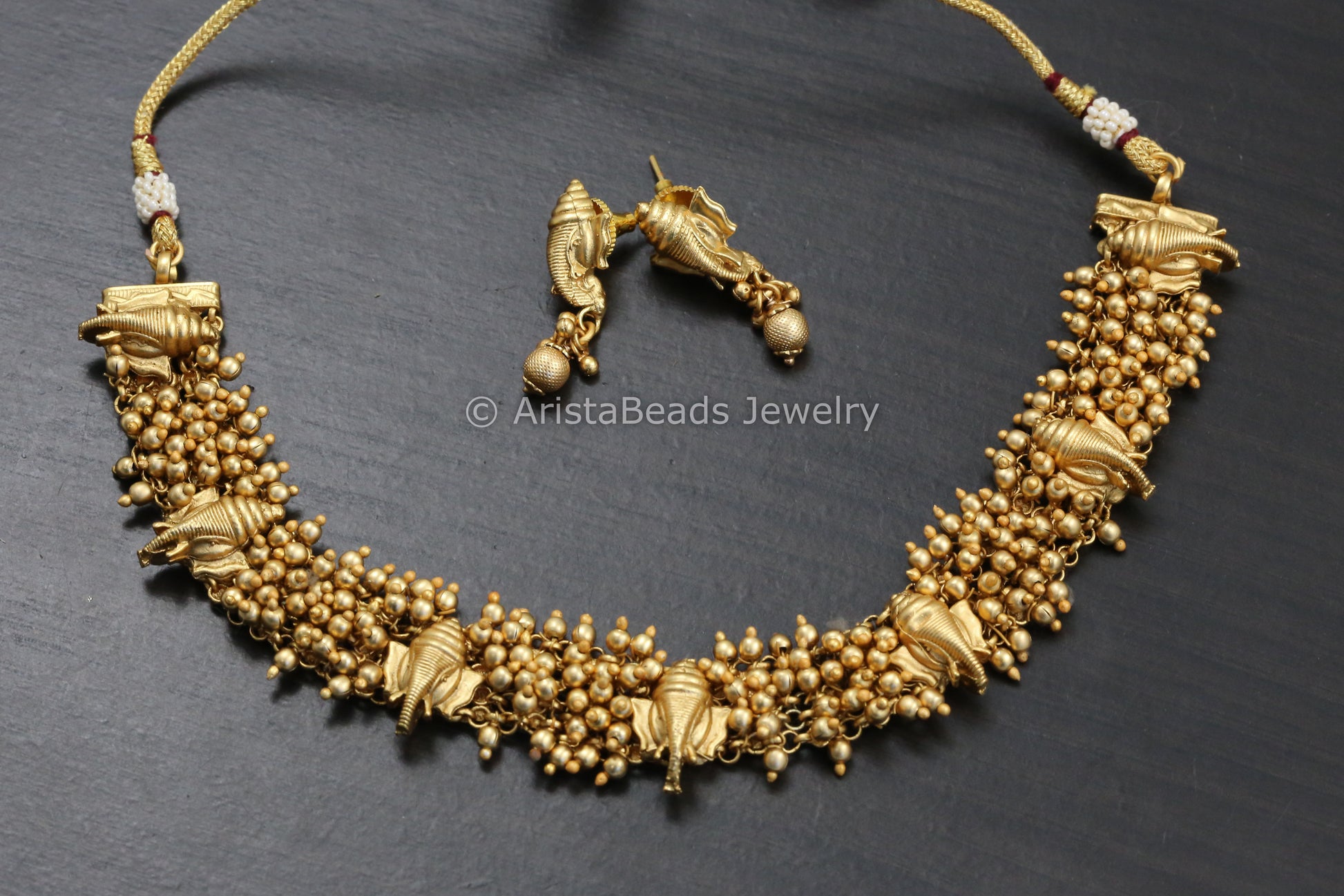 Gajra Style Ganesha Temple Necklace Set - Gold