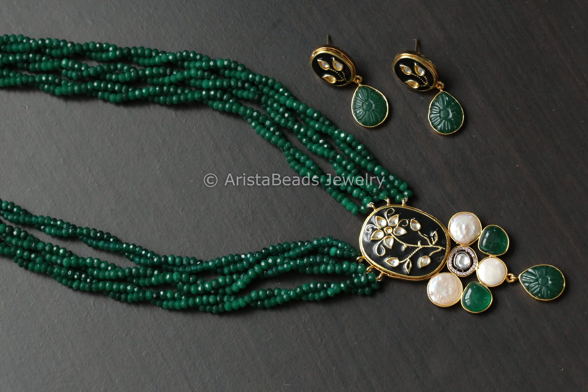 Green Onyx Stone & Enamel Kundan Contemporary Necklace Set