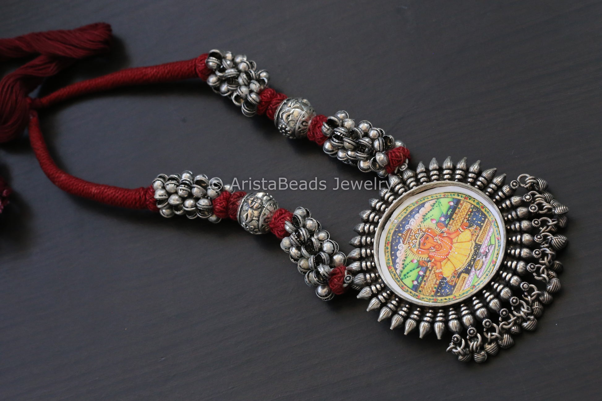Hand Painted Silver Look Necklace - Dark Red Thread