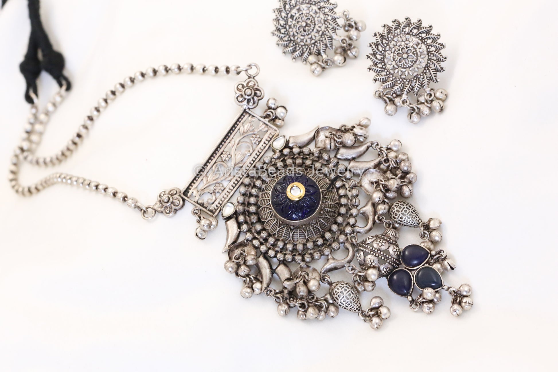 Handmade Carved Stone Kundan Necklace Set - Blue