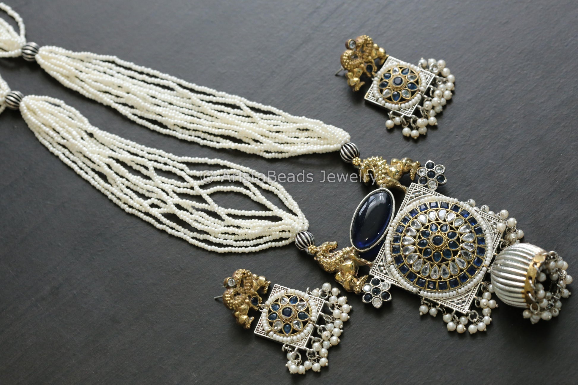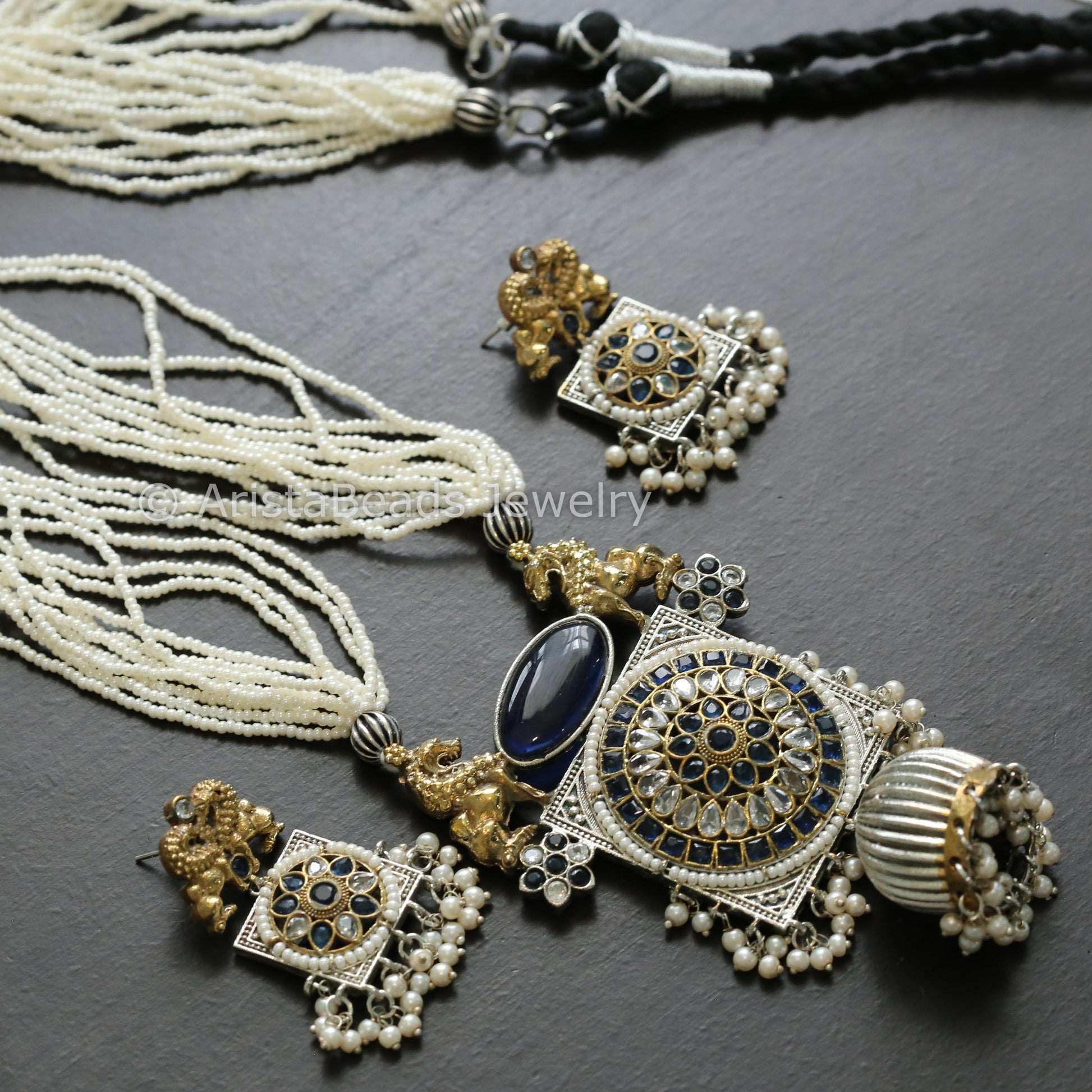 Handmade Dual Tone Jhumka Necklace Set - Blue