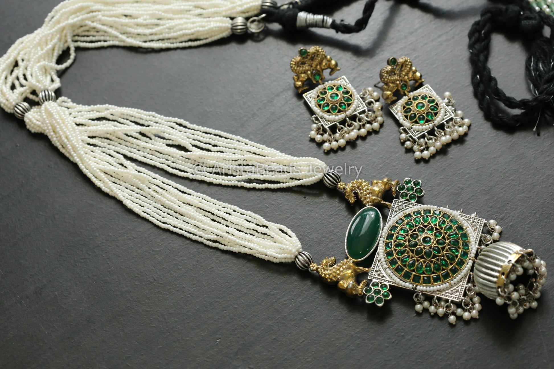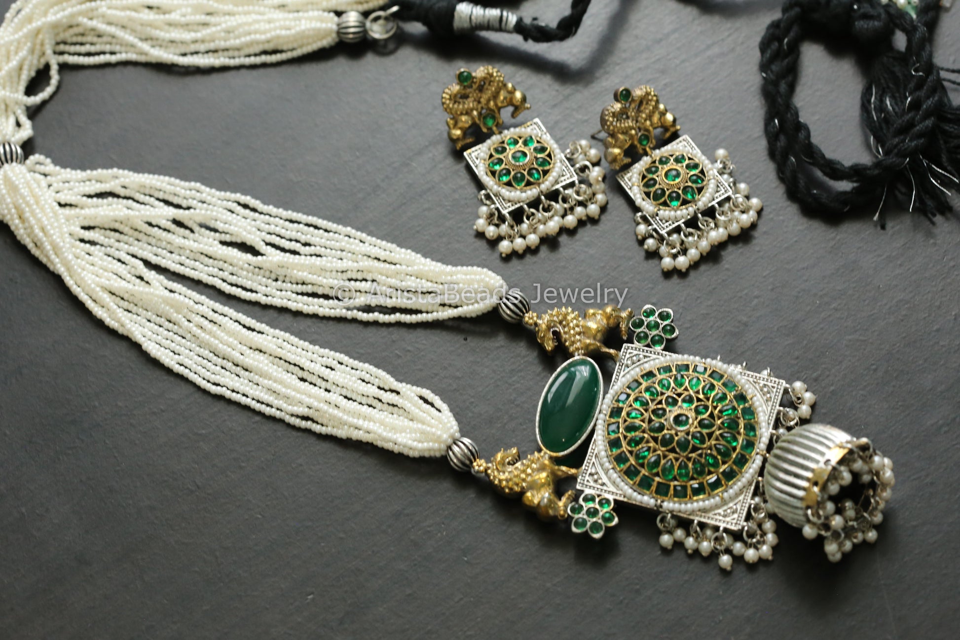 Handmade Dual Tone Jhumka Necklace Set - Green