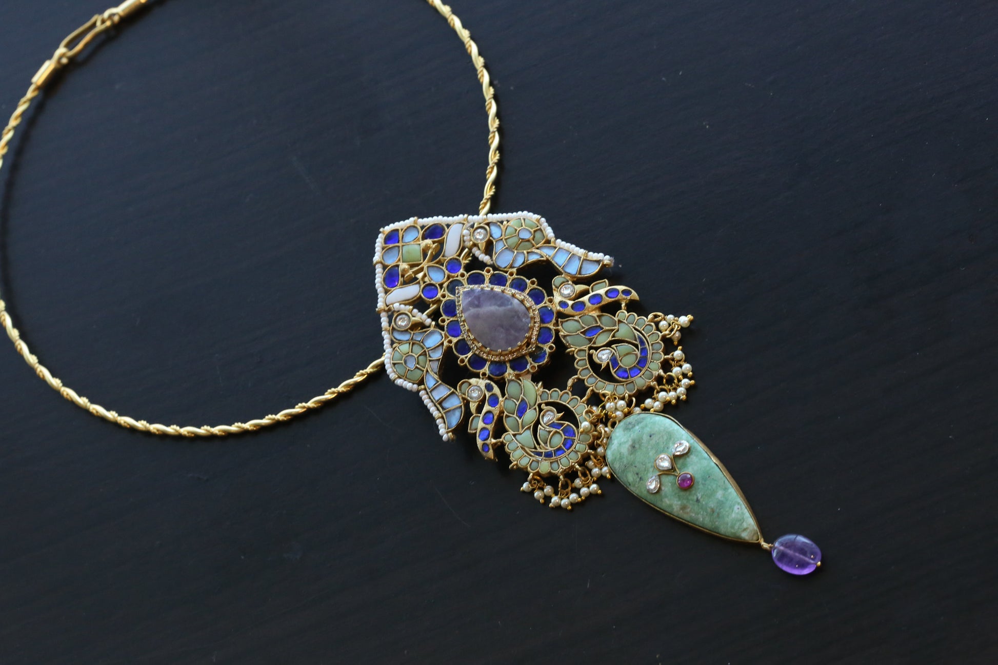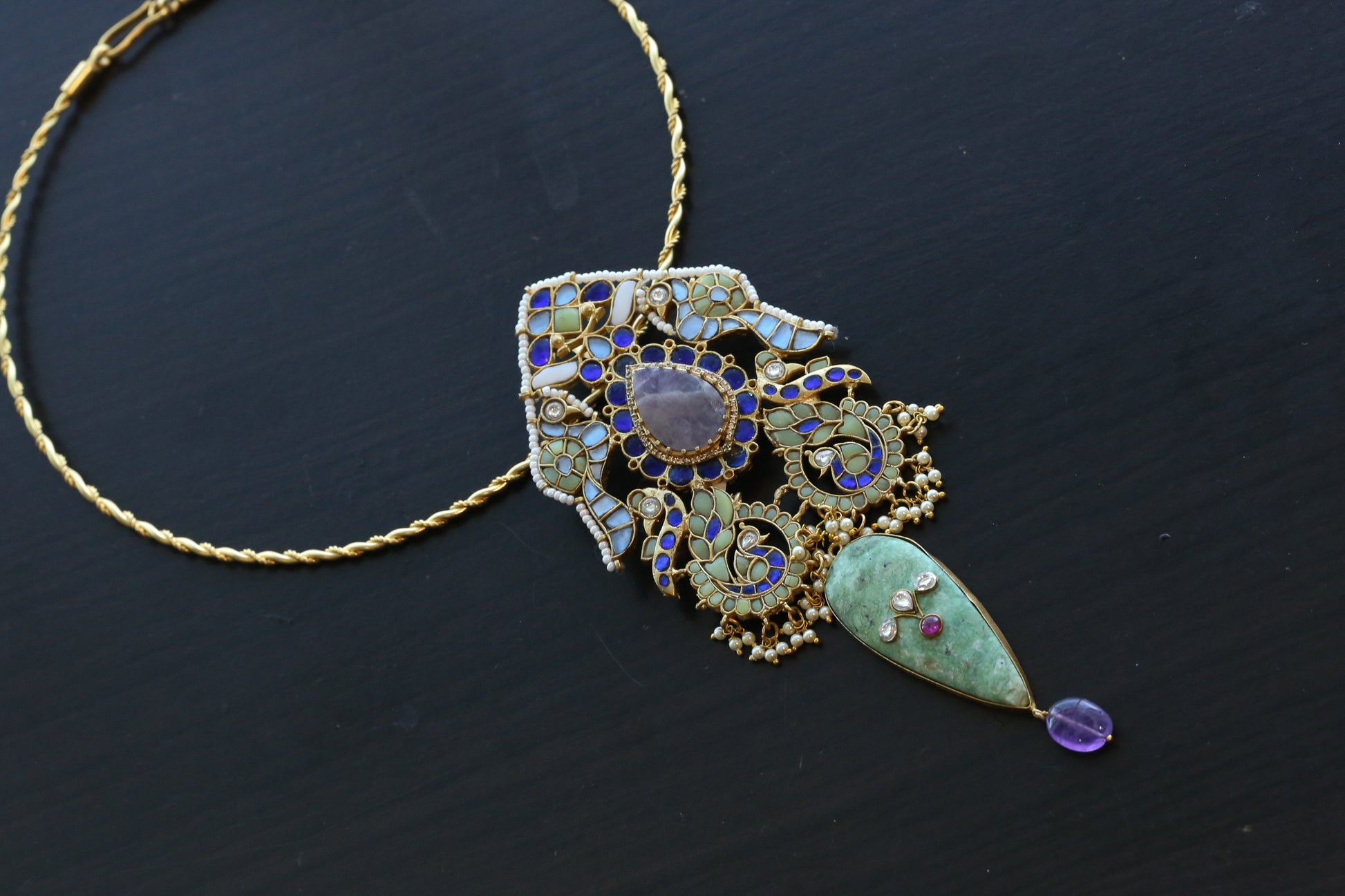 Embrace the exquisite beauty of this Handmade Fusion Jadau Kundan Hasli Set adorned with kundan stones and Amethyst. Experience the luxurious blend of traditional and modern designs that will elevate any outfit to new heights!