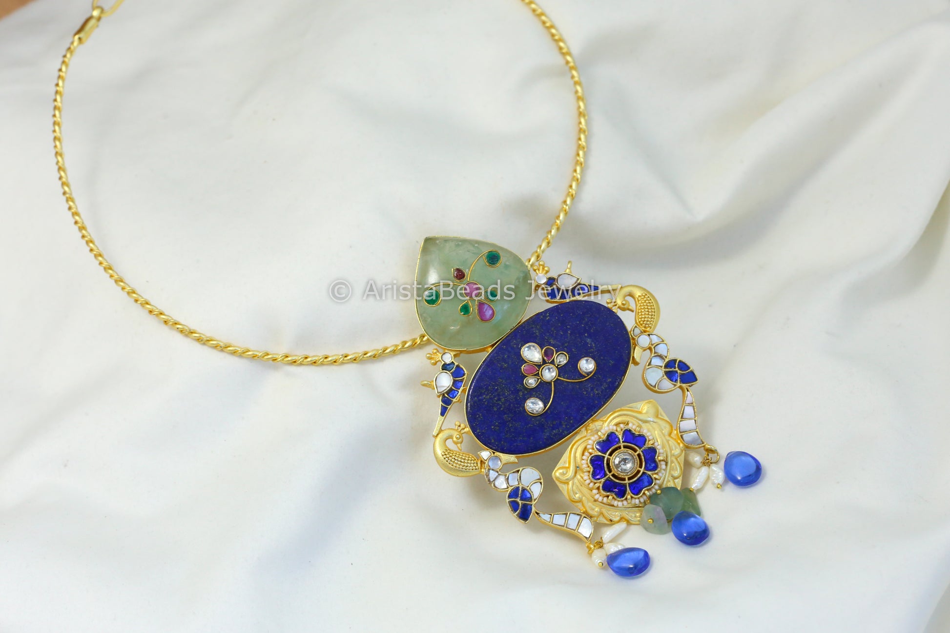 Handmade Jadau Kundan Hasli Necklace - Fluorite Lapis