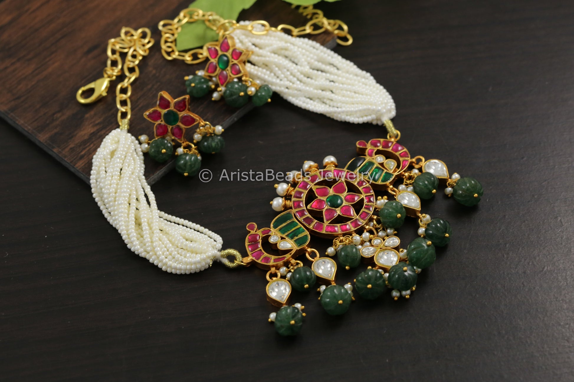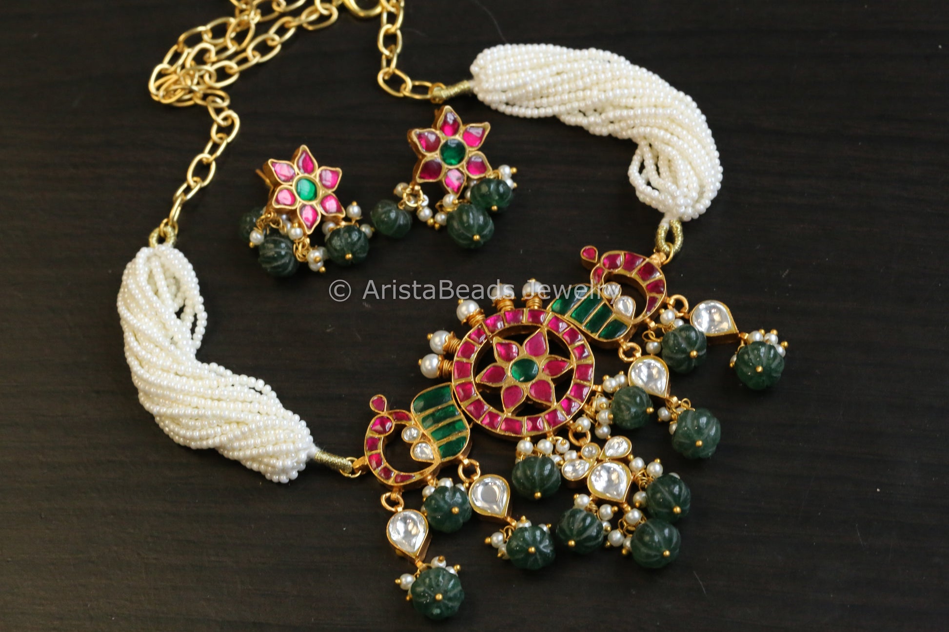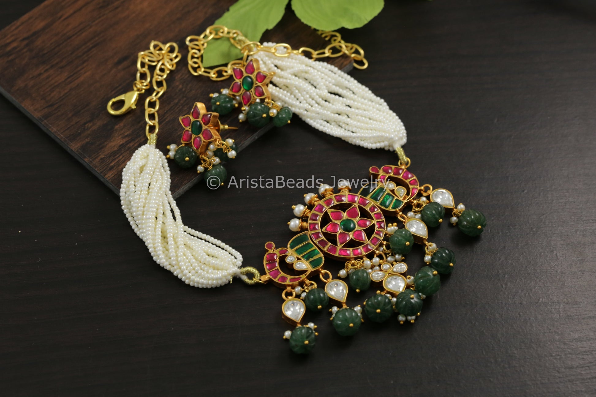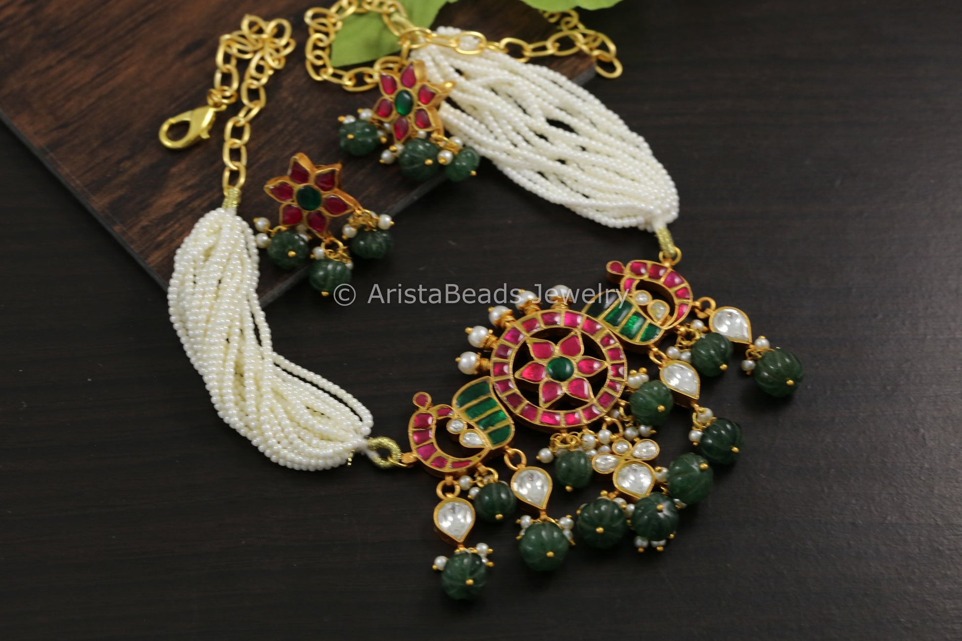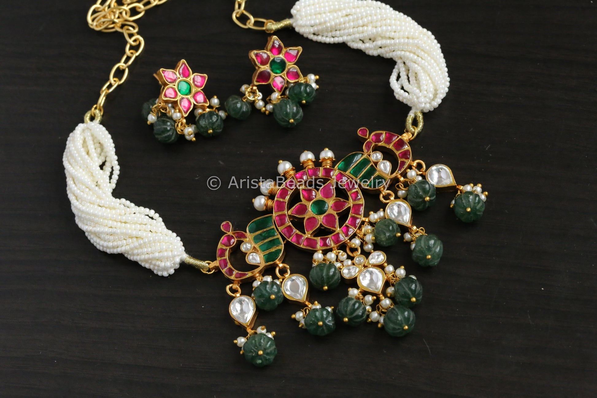 Handmade Jadau Kundan Necklace Choker Set- Fluorite Drops
