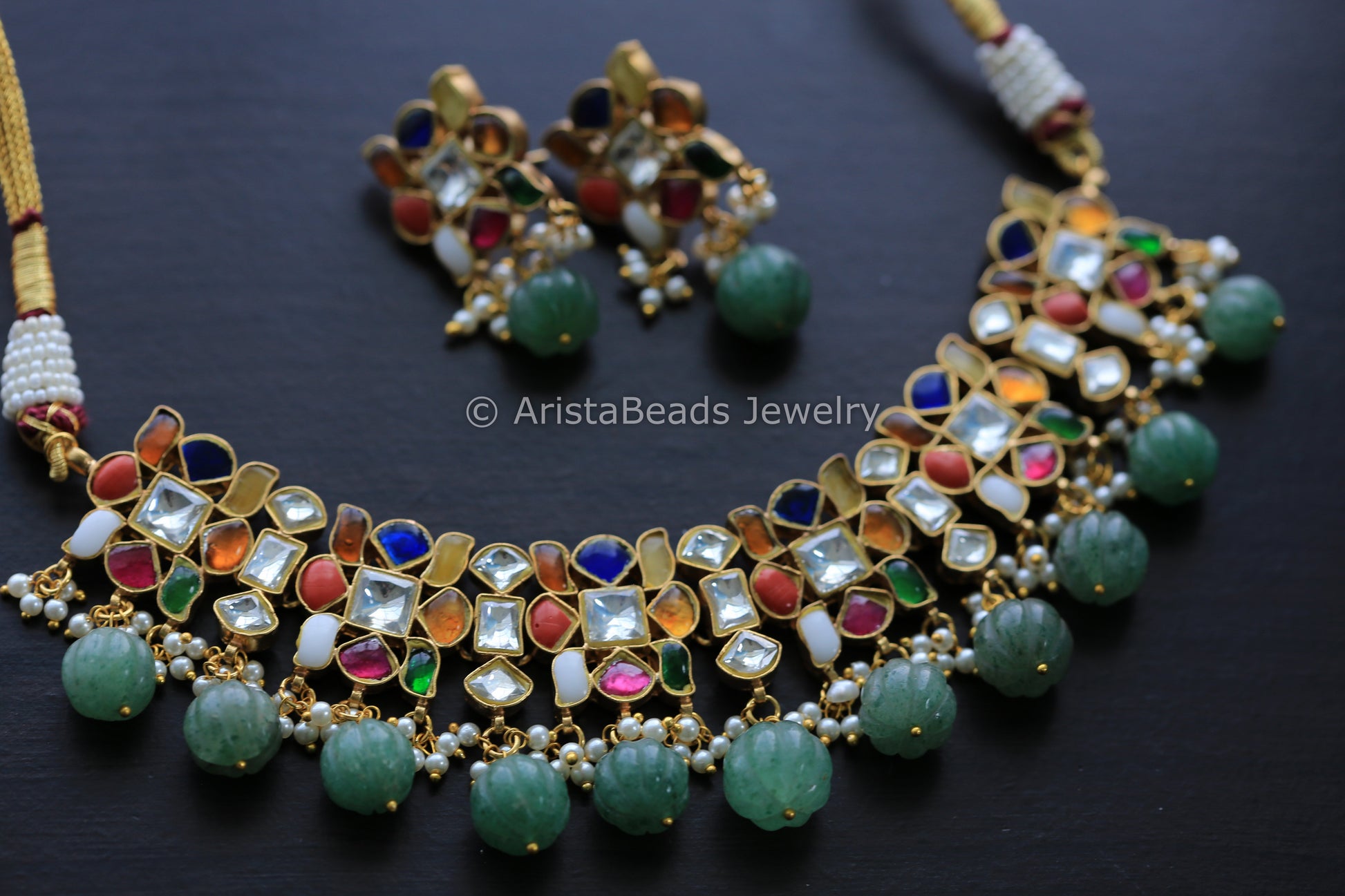 Handmade navratan kundan necklace set with fluorite melon drops.