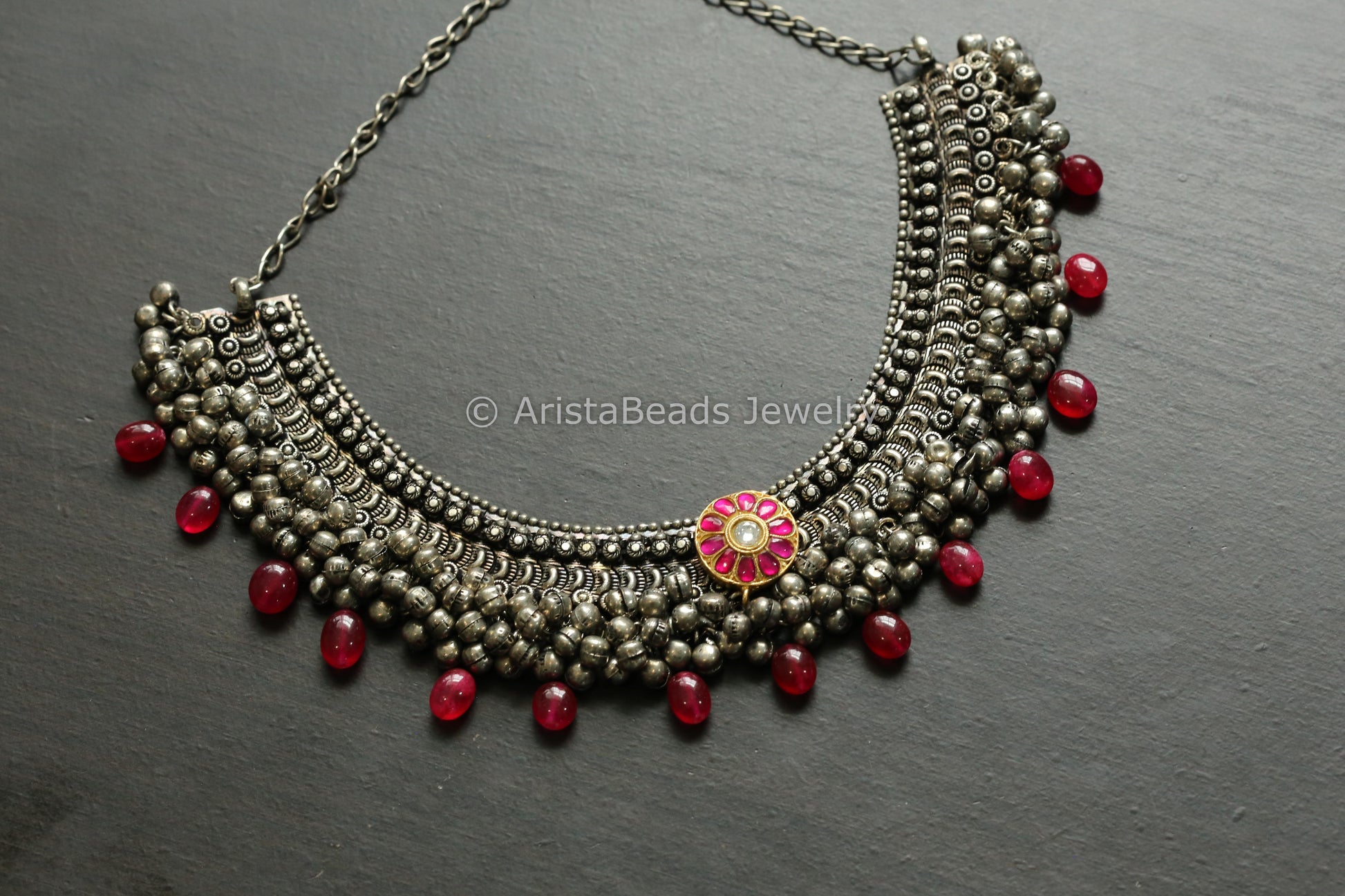 Handmade Oxidized Ghungroo Necklace - Kundan Jadau Motif