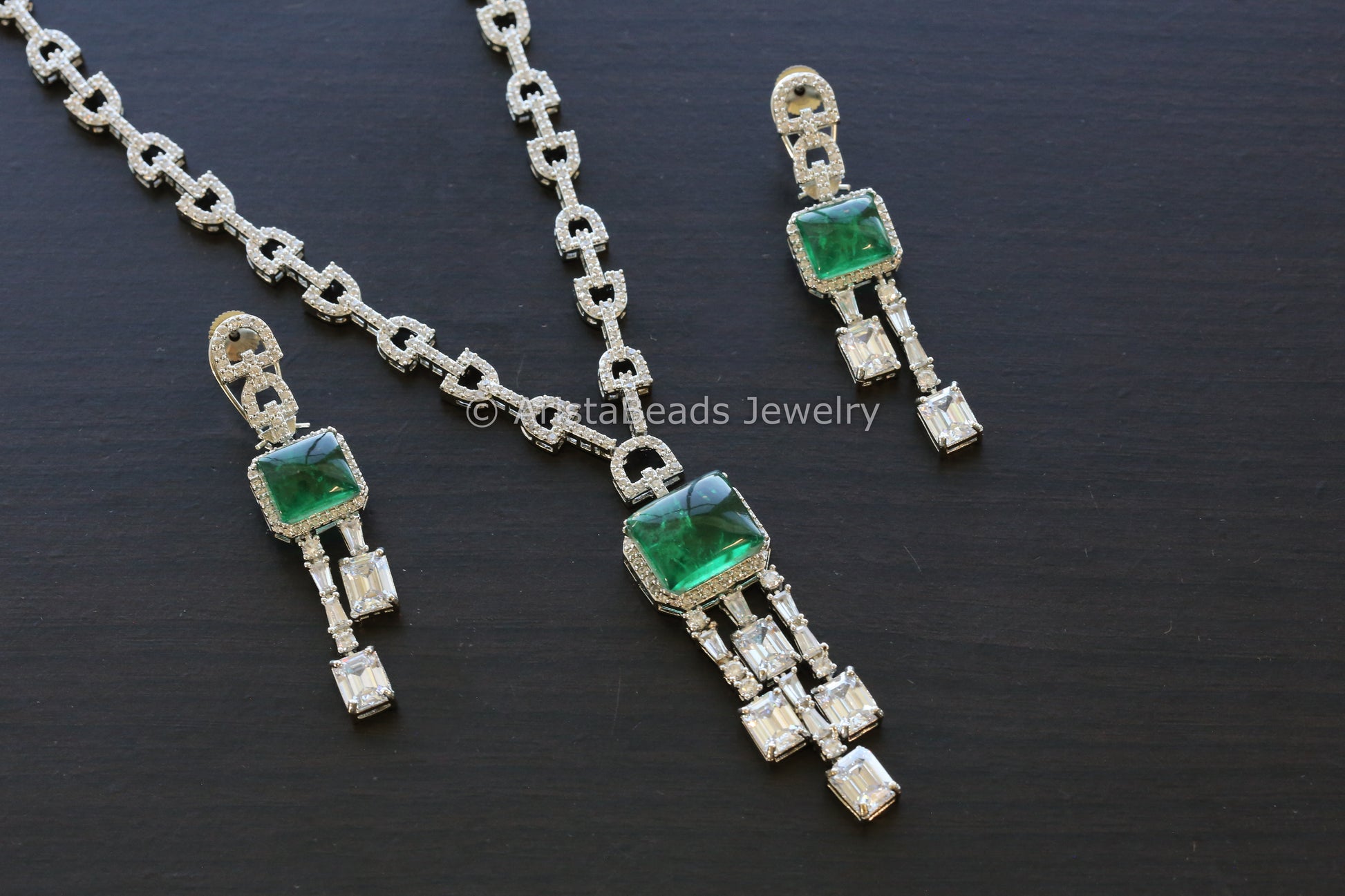 Indowestern Silver Finish CZ & Emerald Doublet Necklace Set