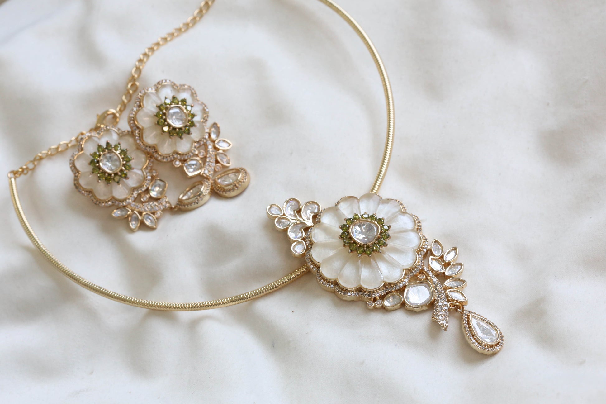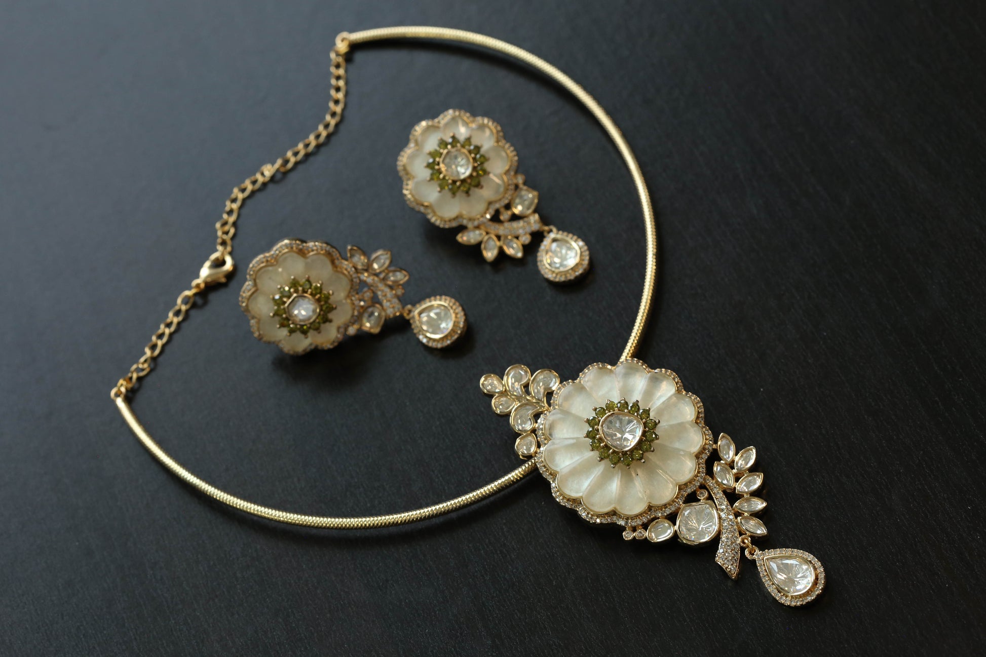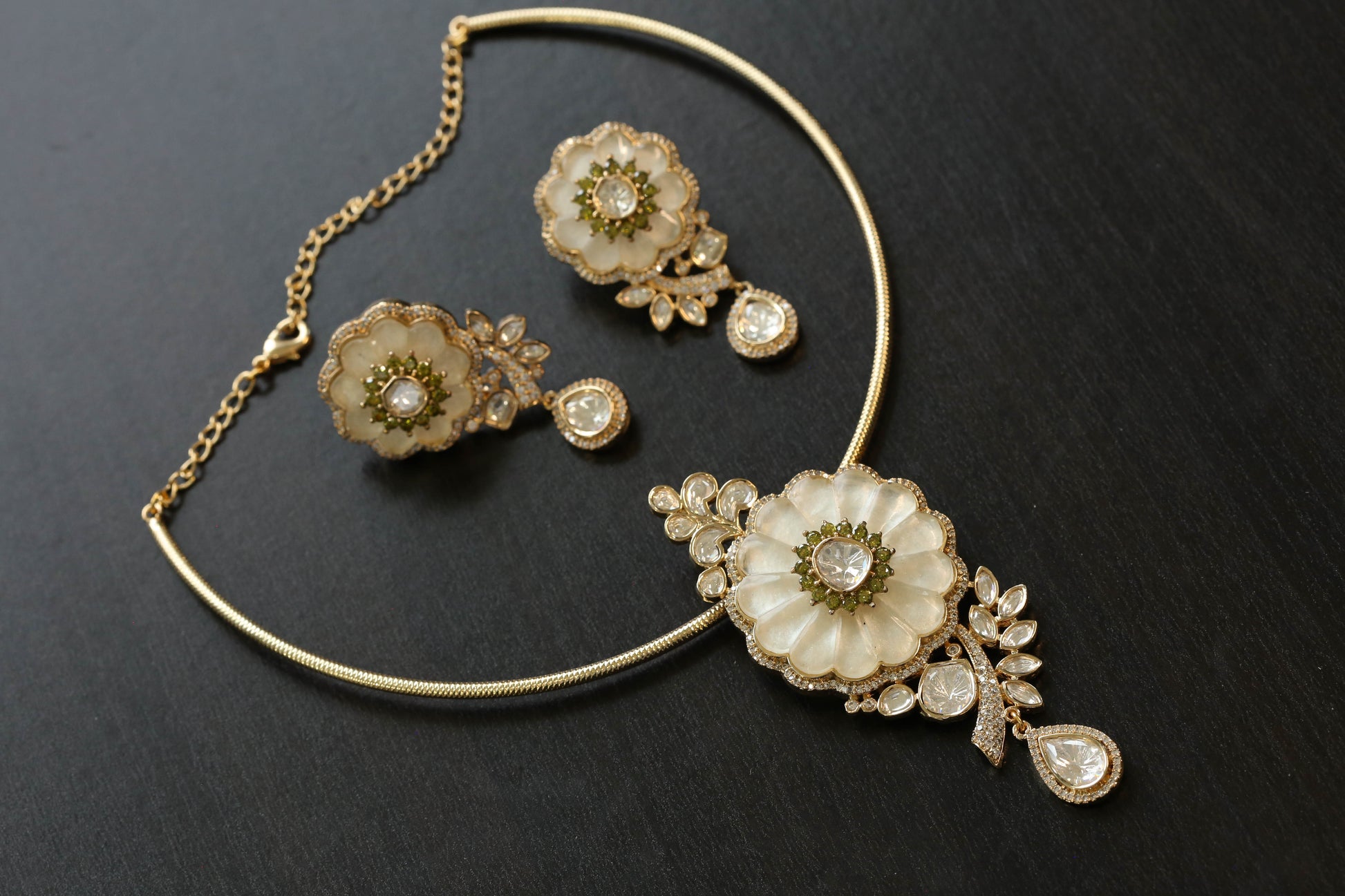 Ivory & Uncut Polki Hasli Set - Olive Green ((103-44)