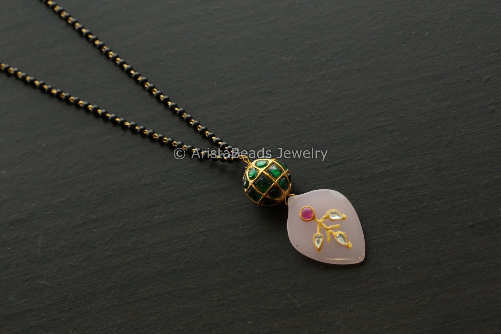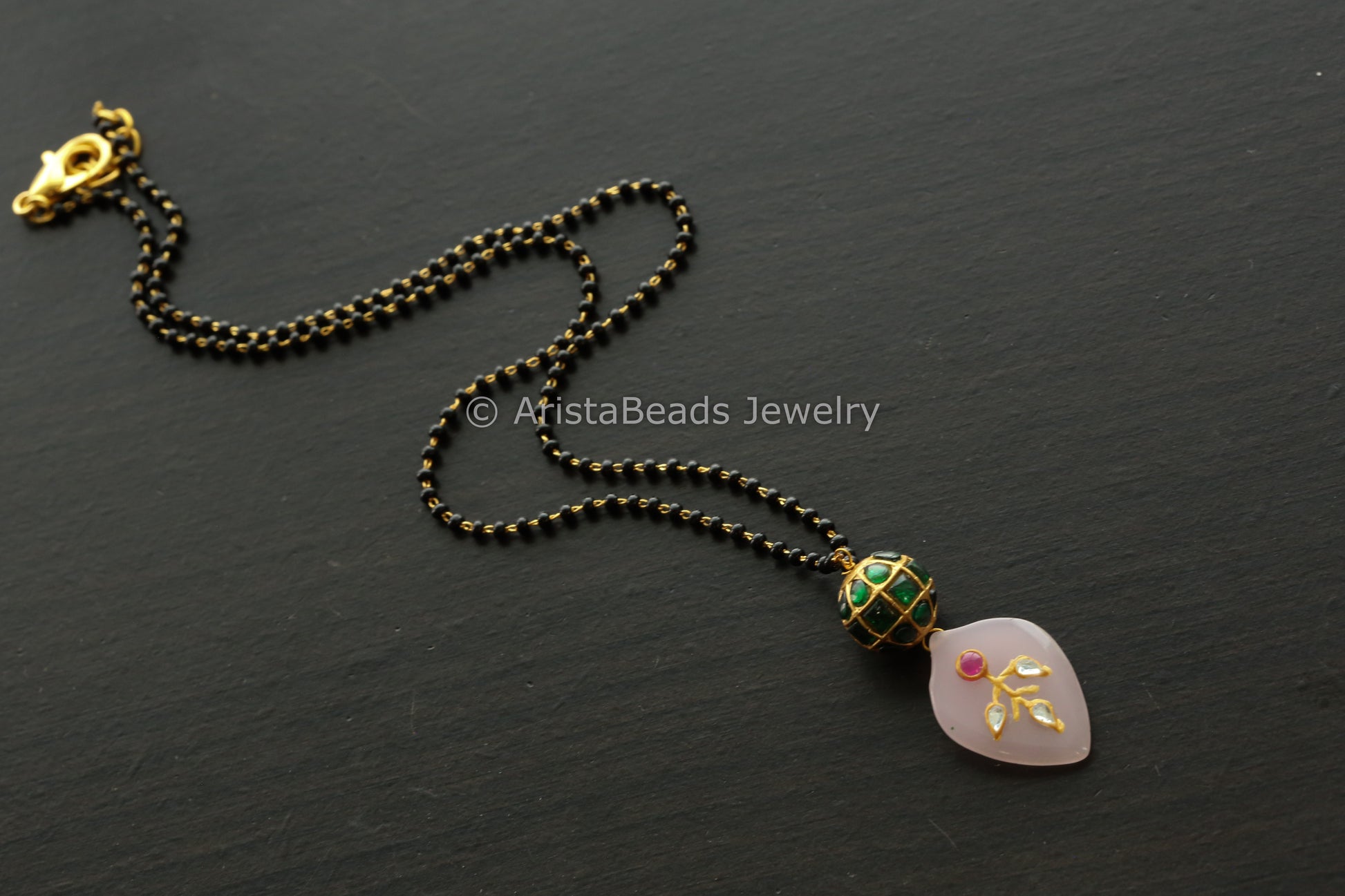 Jadau Ball Black Bead Chain With Pink Jadau Stone Drop