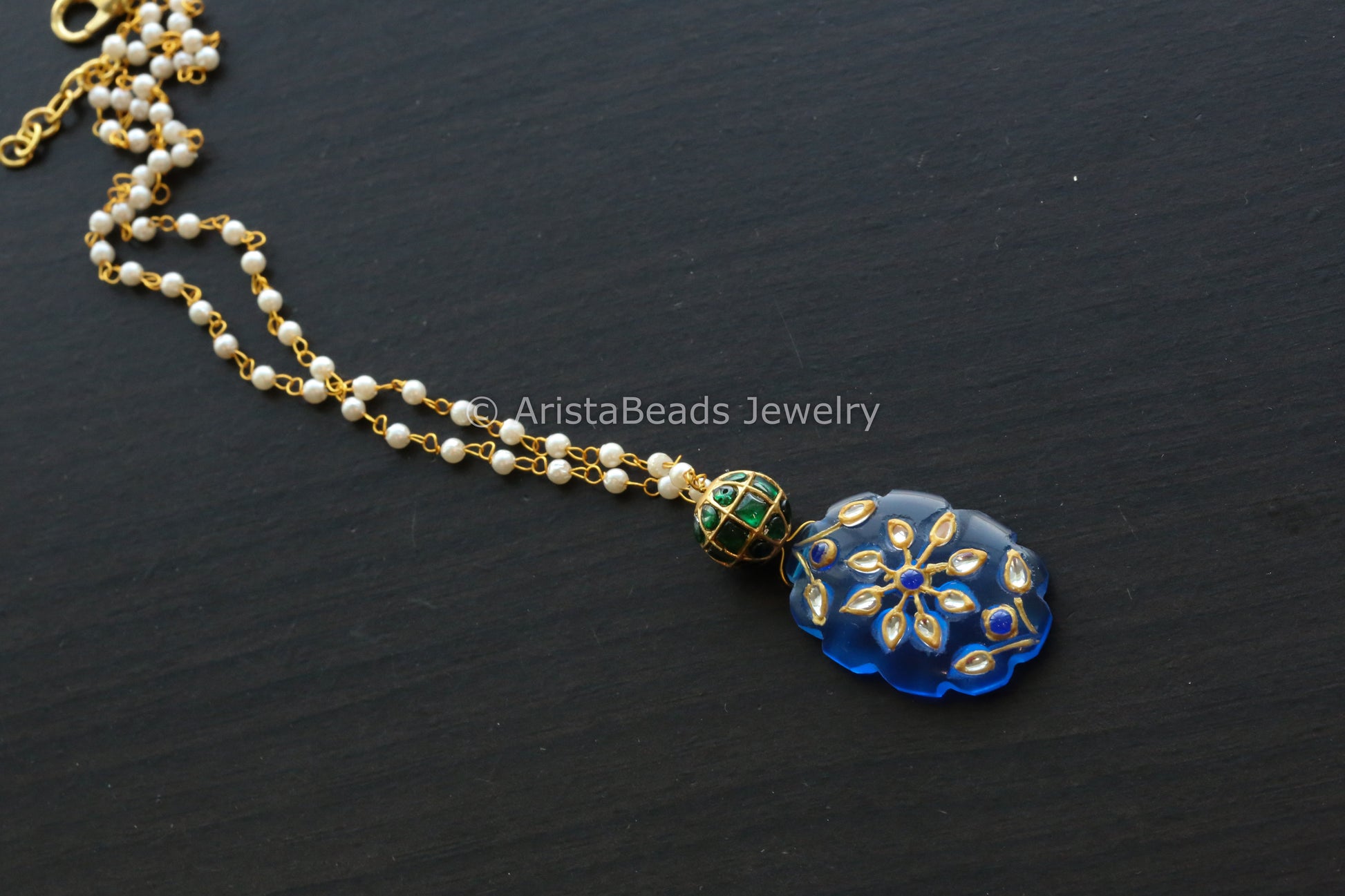 Jadau Ball Pearl Chain With Blue Jadau Work Stone Drop