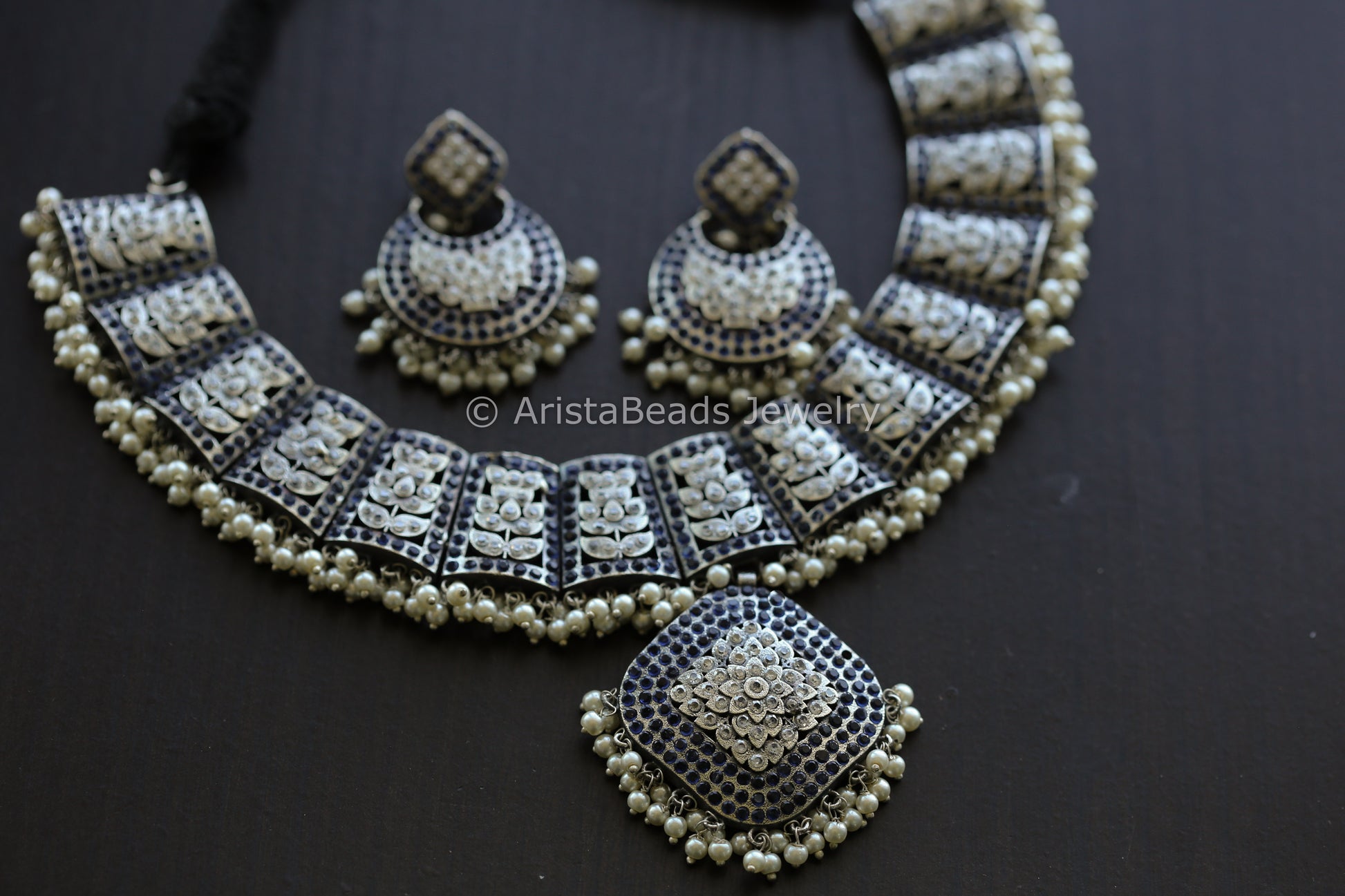 Jadau CZ Oxidized Necklace Set - Blue Clear