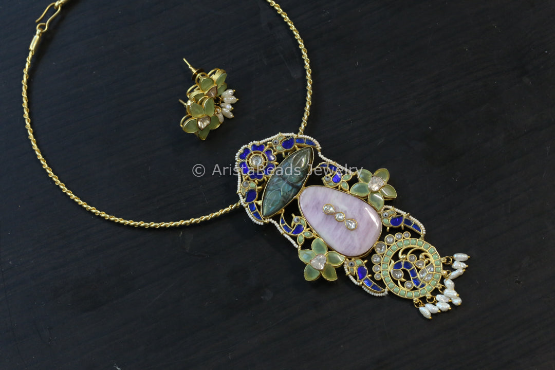 Jadau Fusion Green Blue Pendant Set - Labradorite & Chalcedony (Removable)