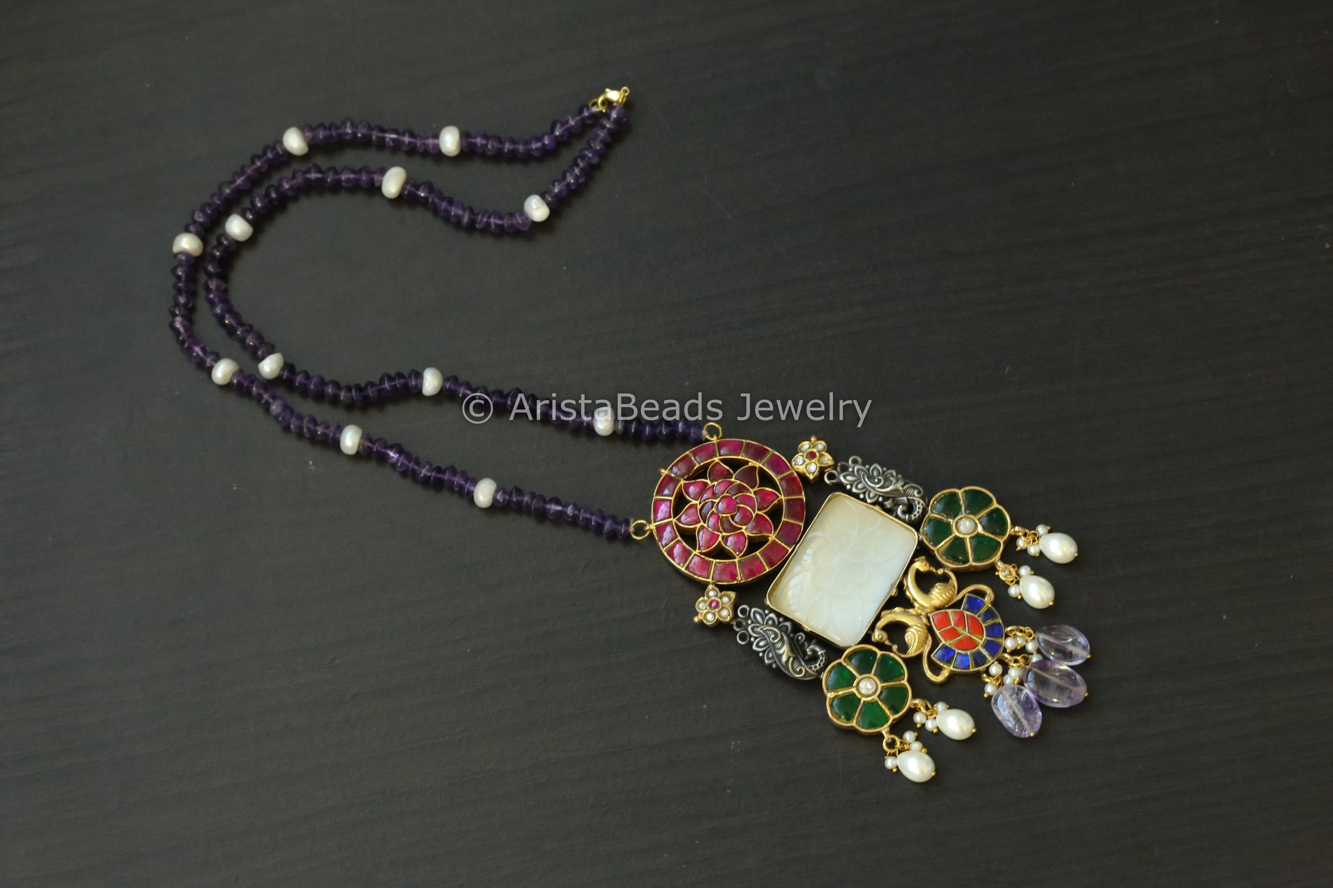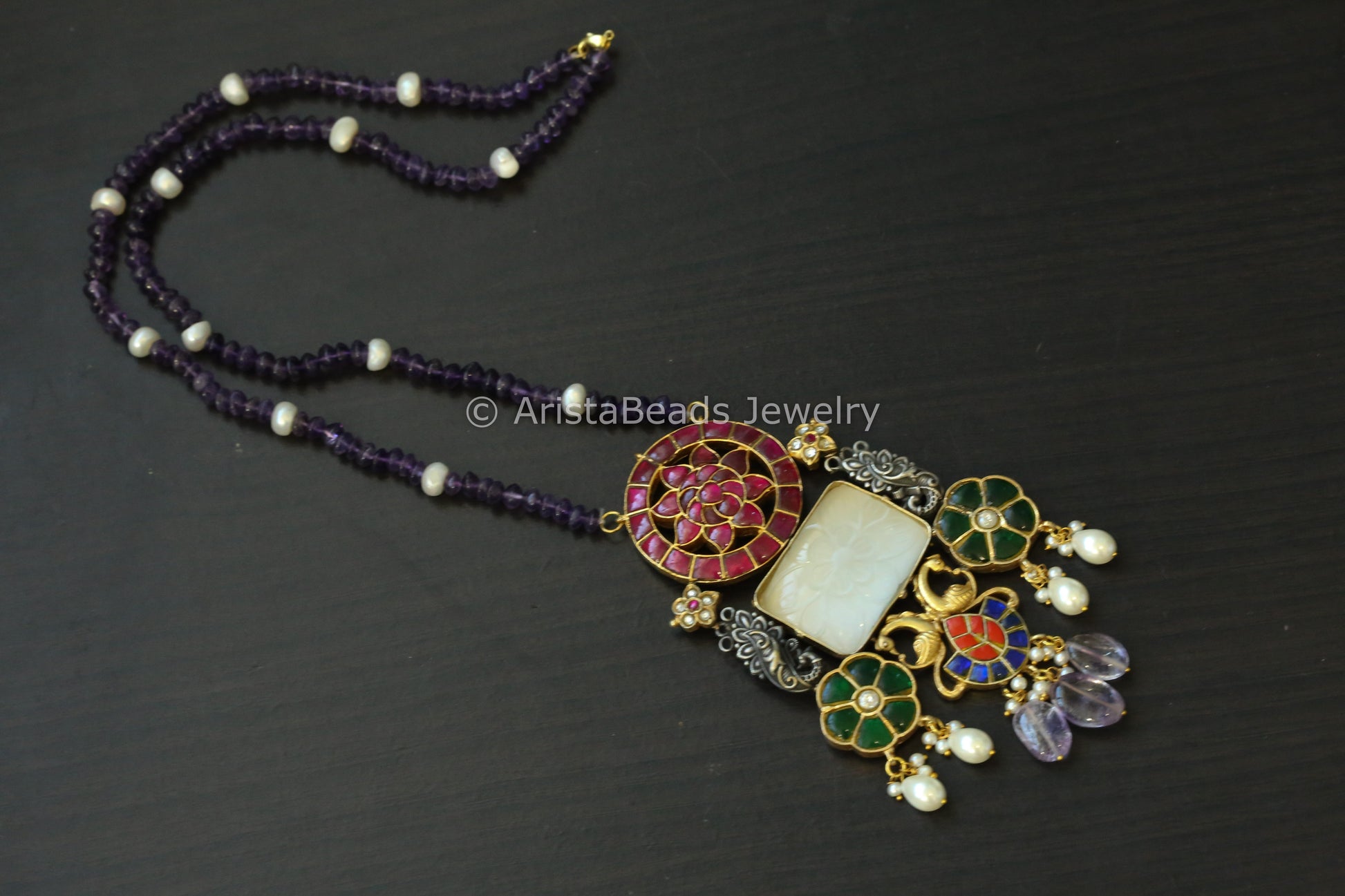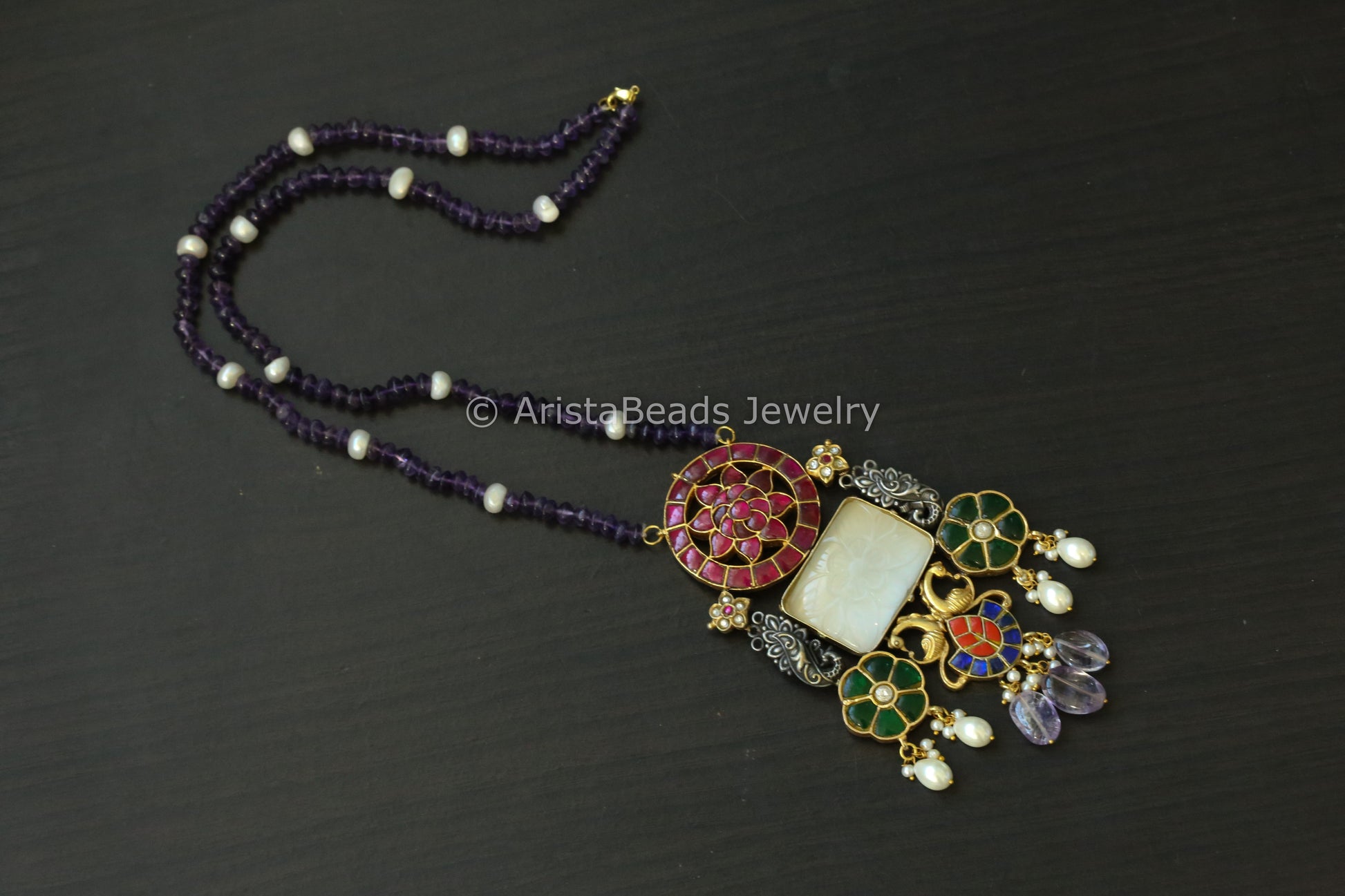 Jadau Kundan Fusion Necklace In Real Pearls & Amethyst Mala