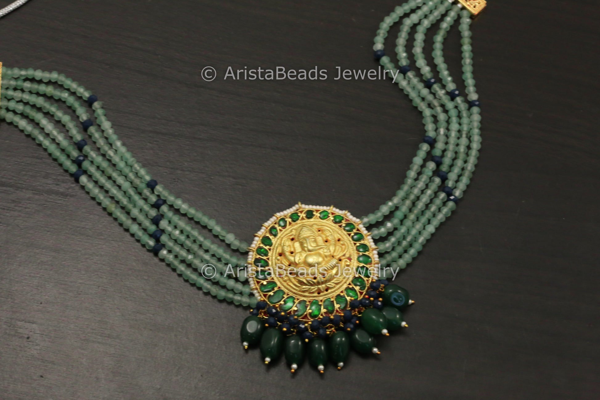 Jadau Kundan Ganesha Choker Necklace - Blue Green Drops