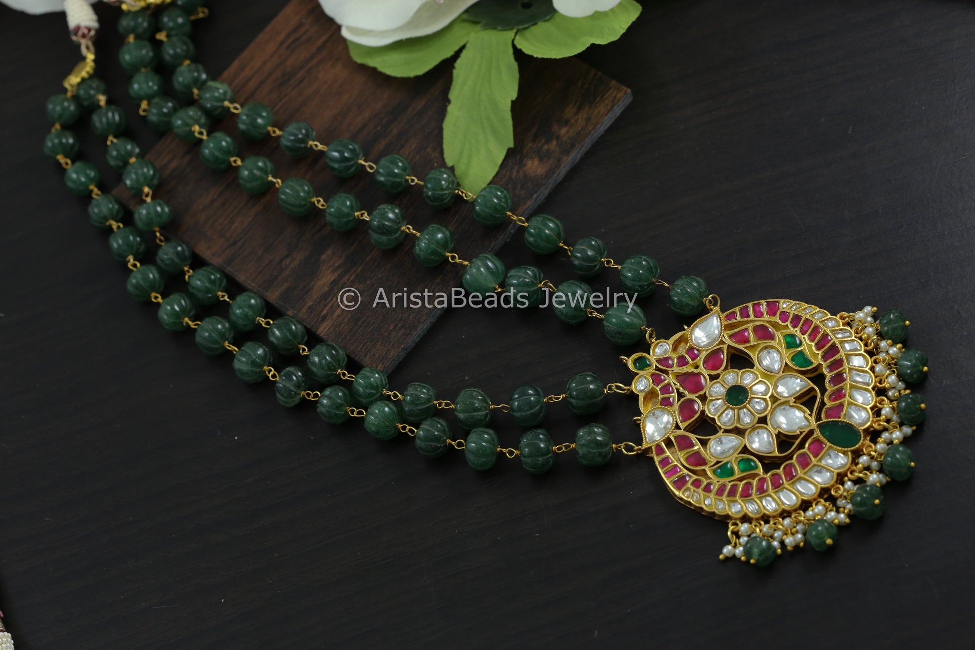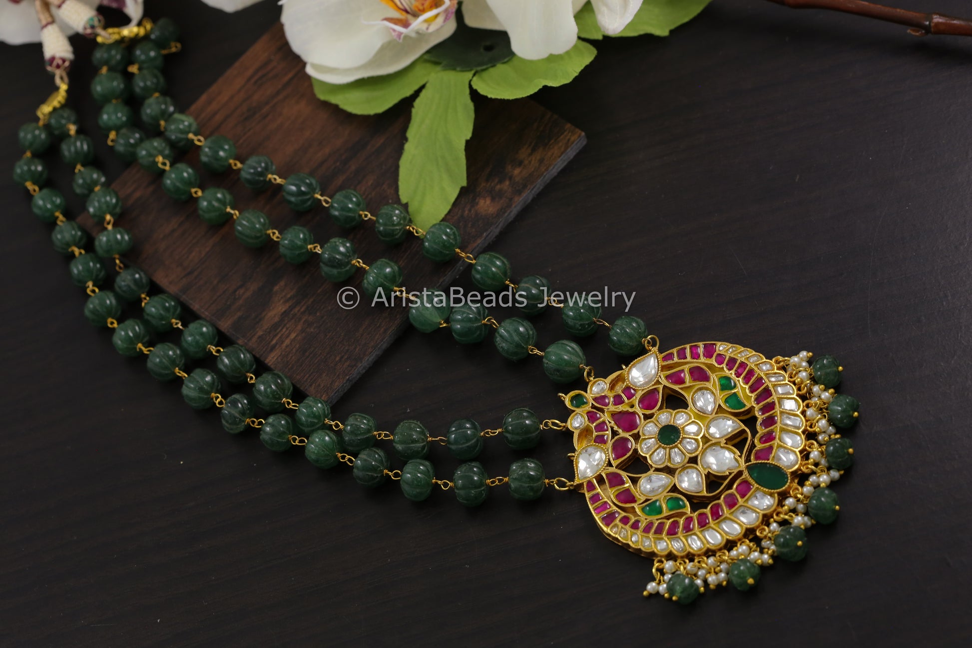 Jadau Kundan Necklace In Real Strawberry Quartz Beads
