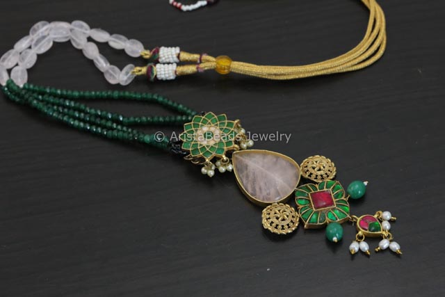 Jadau Kundan Pendant Necklace - Rose Quartz Cab
