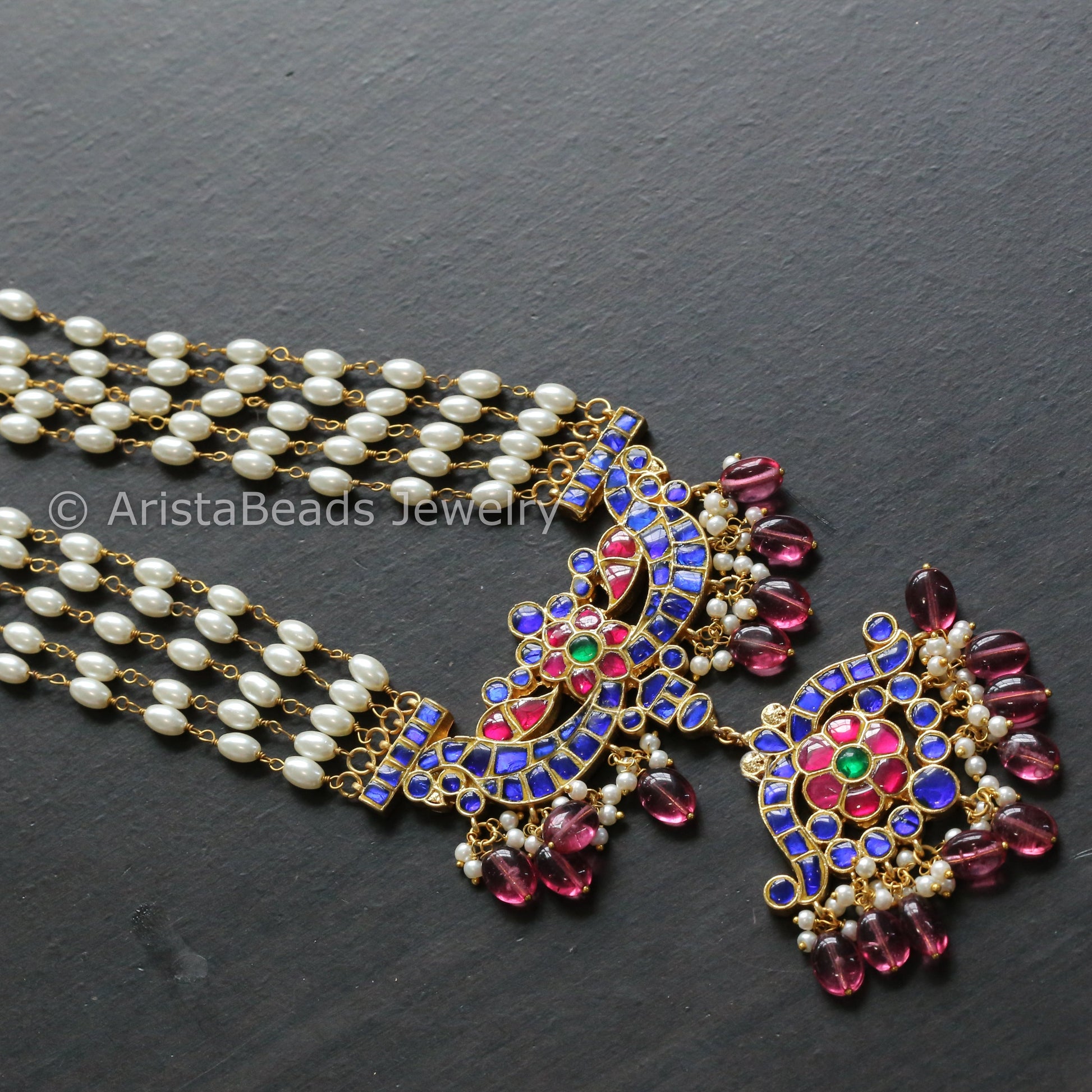 Jadau Kundan Rice Pearl Necklace - Rhodolite Drops
