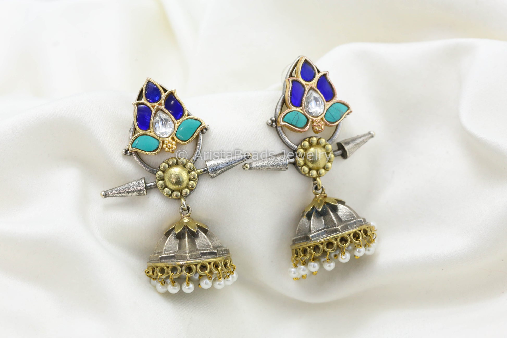 Jadau Kundan Silver Look Fusion Jhumka -Turquoise Blue