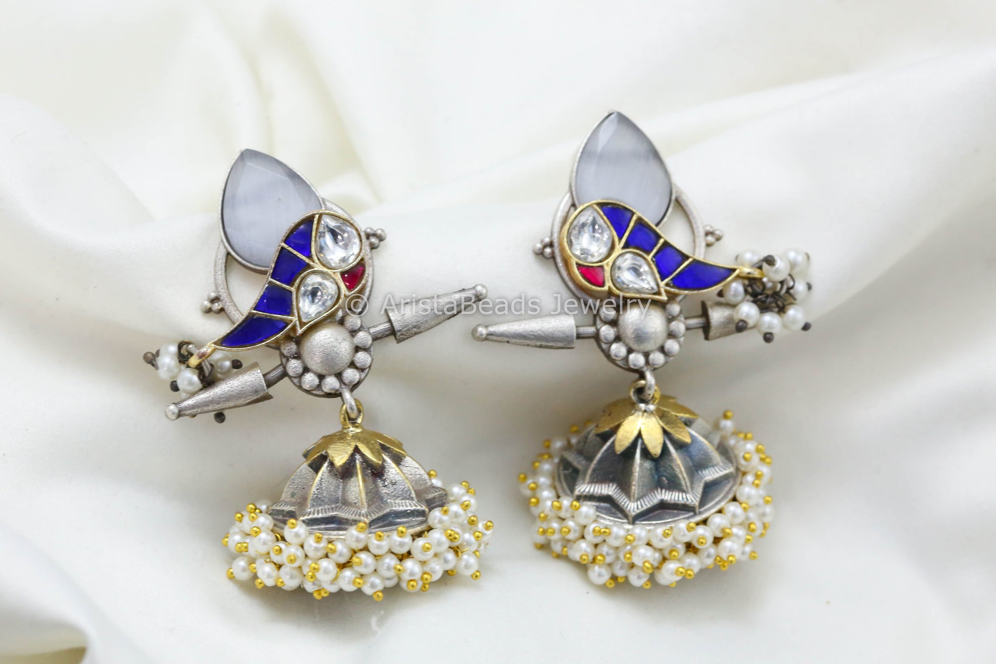 Jadau Kundan Silver Replica Fusion Jhumka -Blue