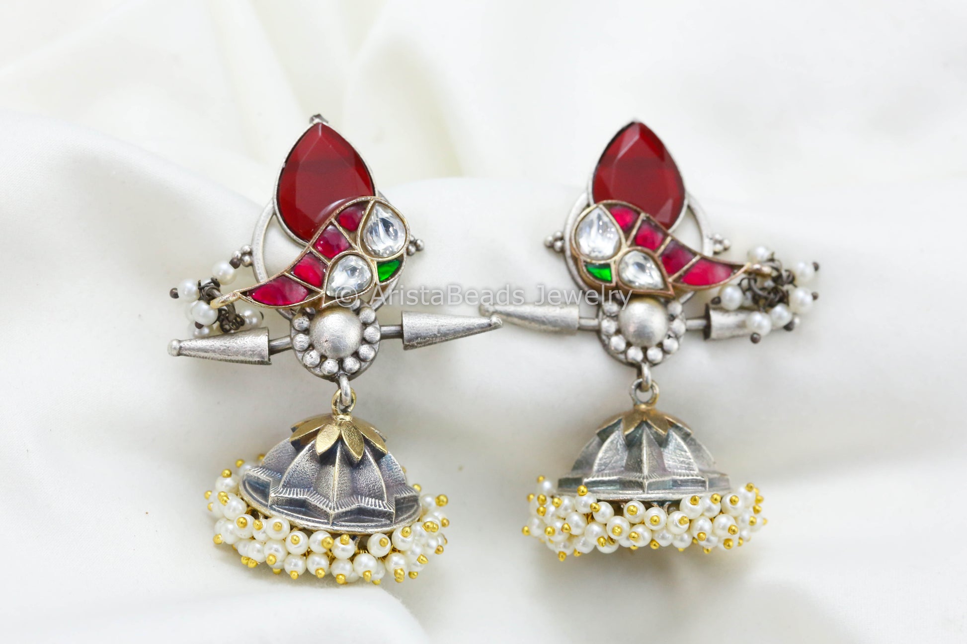 Jadau Kundan Silver Replica Fusion Jhumka -Ruby
