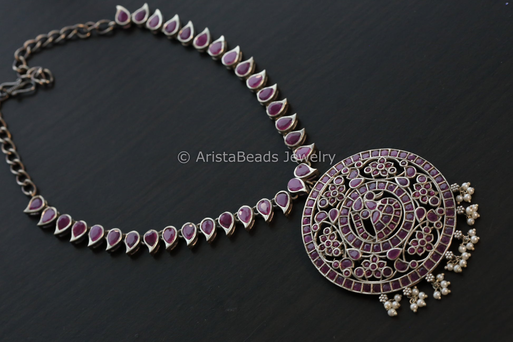 Jadau Look Alike Oxidized CZ Peacock Necklace - Ruby