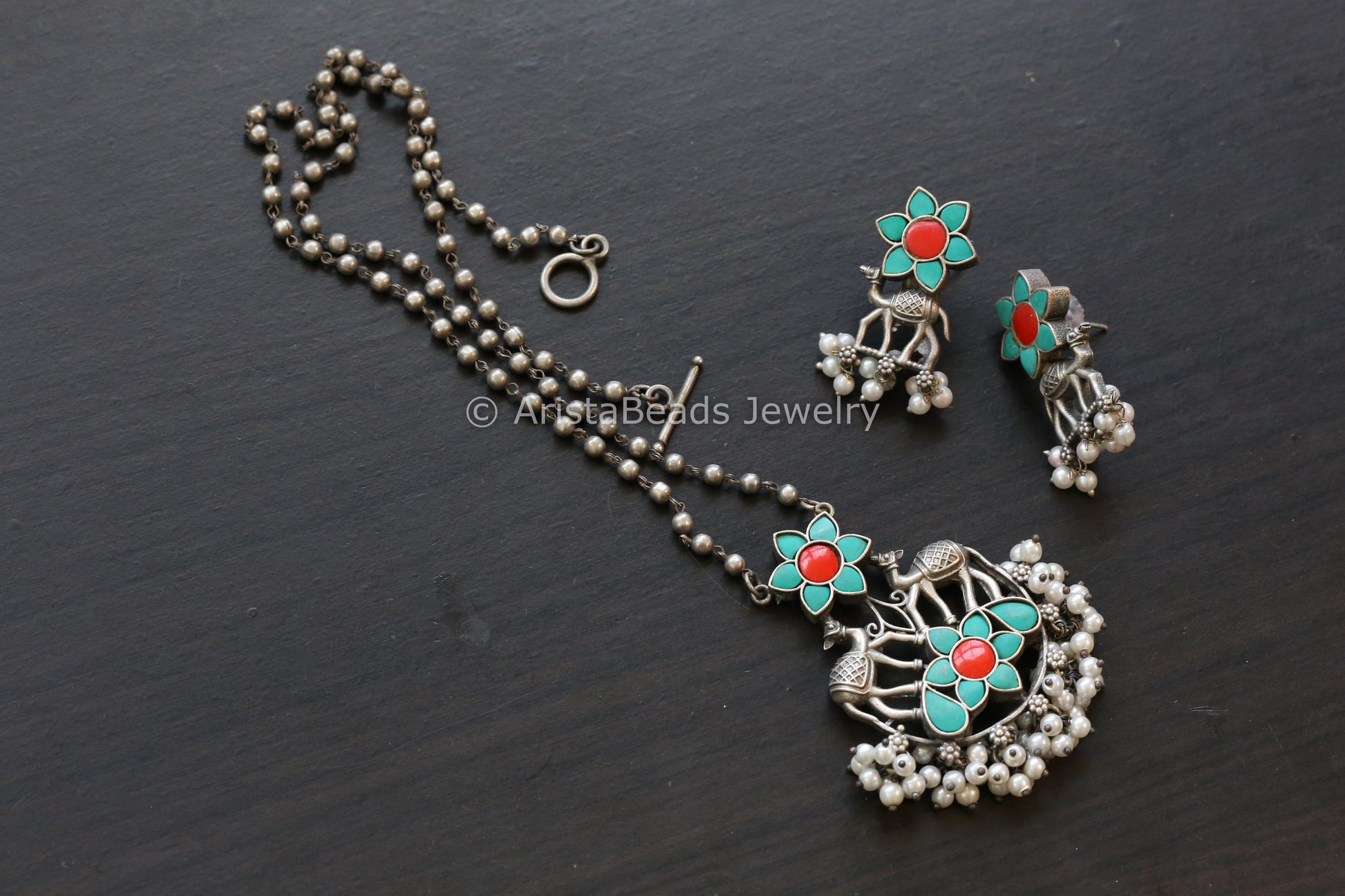 Jadau & Pearls Silver Look Alike Necklace Set -Turquoise Ruby