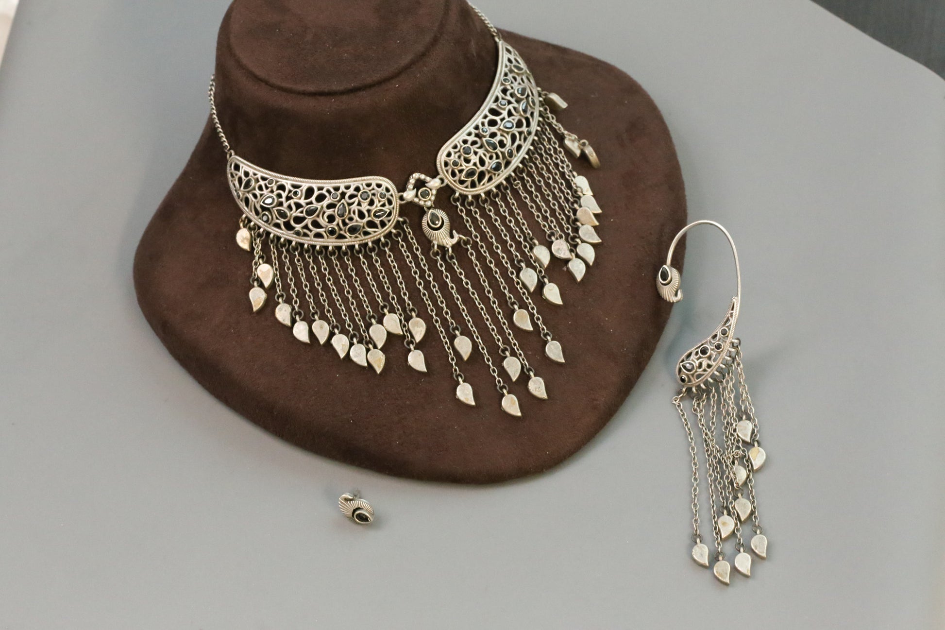 This stunning set brings together timeless artistry and contemporary style, featuring a gracefully designed necklace complemented by a single stud earring and ear cuff that create an effortlessly sophisticated, asymmetrical look. Ideal for those who appreciate the marriage of heritage techniques with modern aesthetics.
