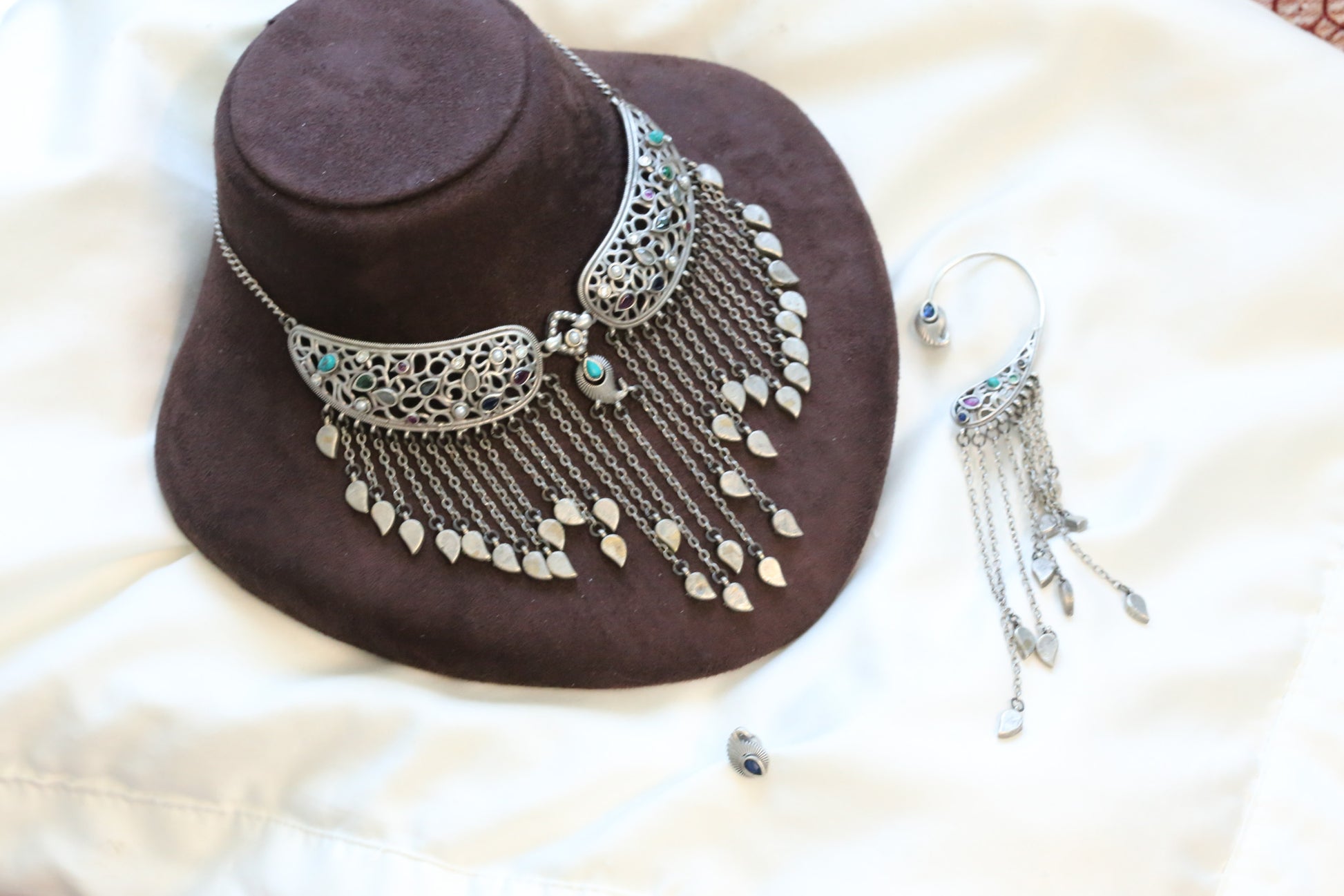 This stunning set brings together timeless artistry and contemporary style, featuring a gracefully designed necklace complemented by a single stud earring and ear cuff that create an effortlessly sophisticated, asymmetrical look. Ideal for those who appreciate the marriage of heritage techniques with modern aesthetics.