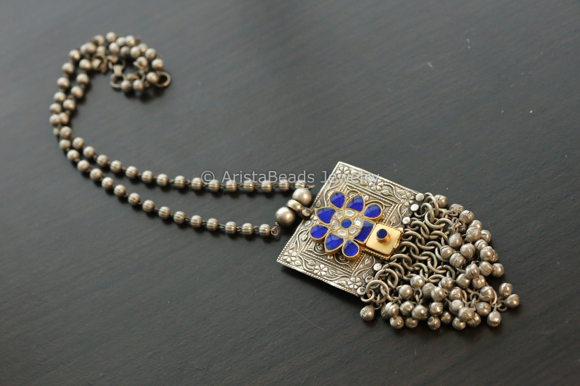 Kundan Fusion Ghungroo Pendant Chain Necklace - Blue