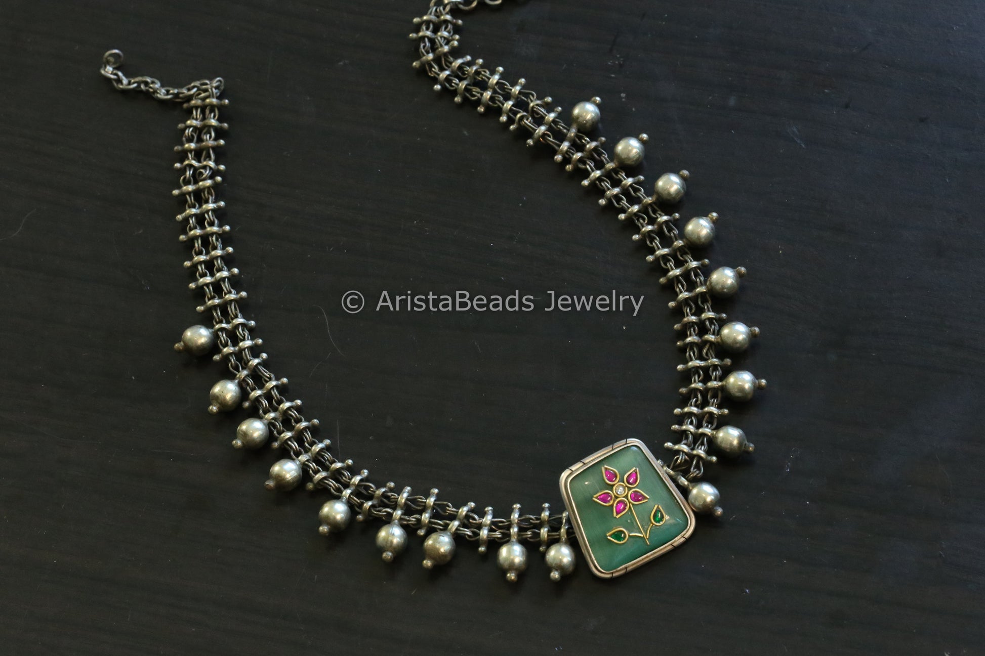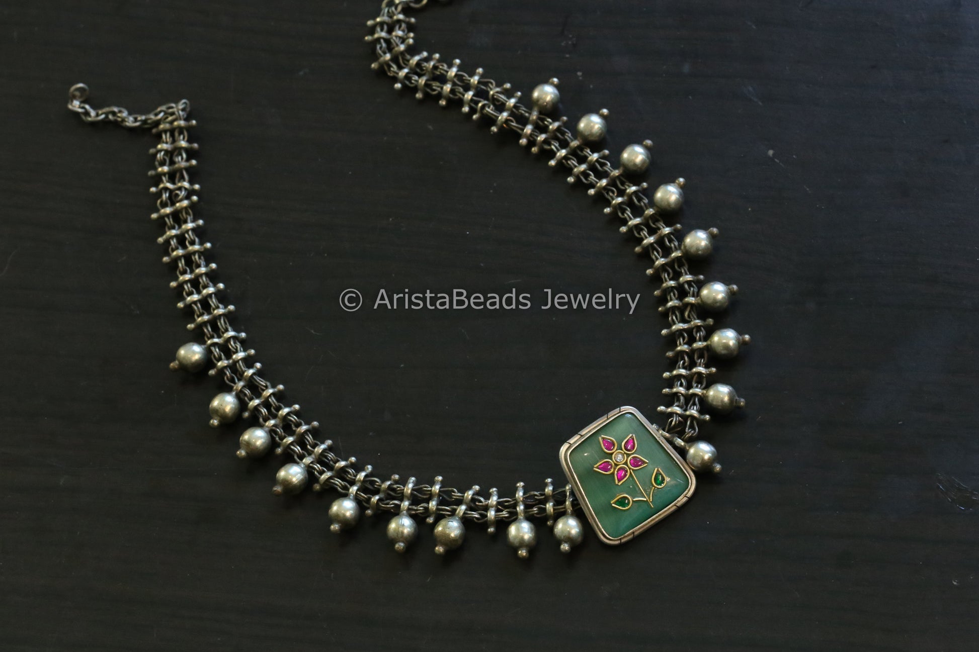 Kundan Inlay Silver Look Alike Fusion Necklace - Mint