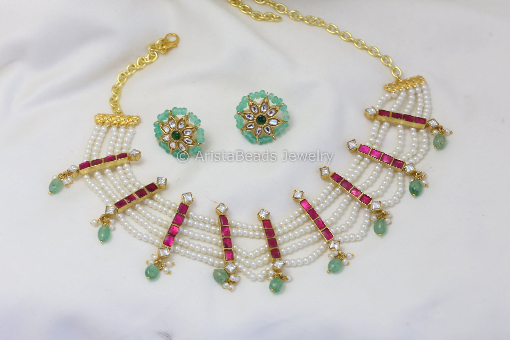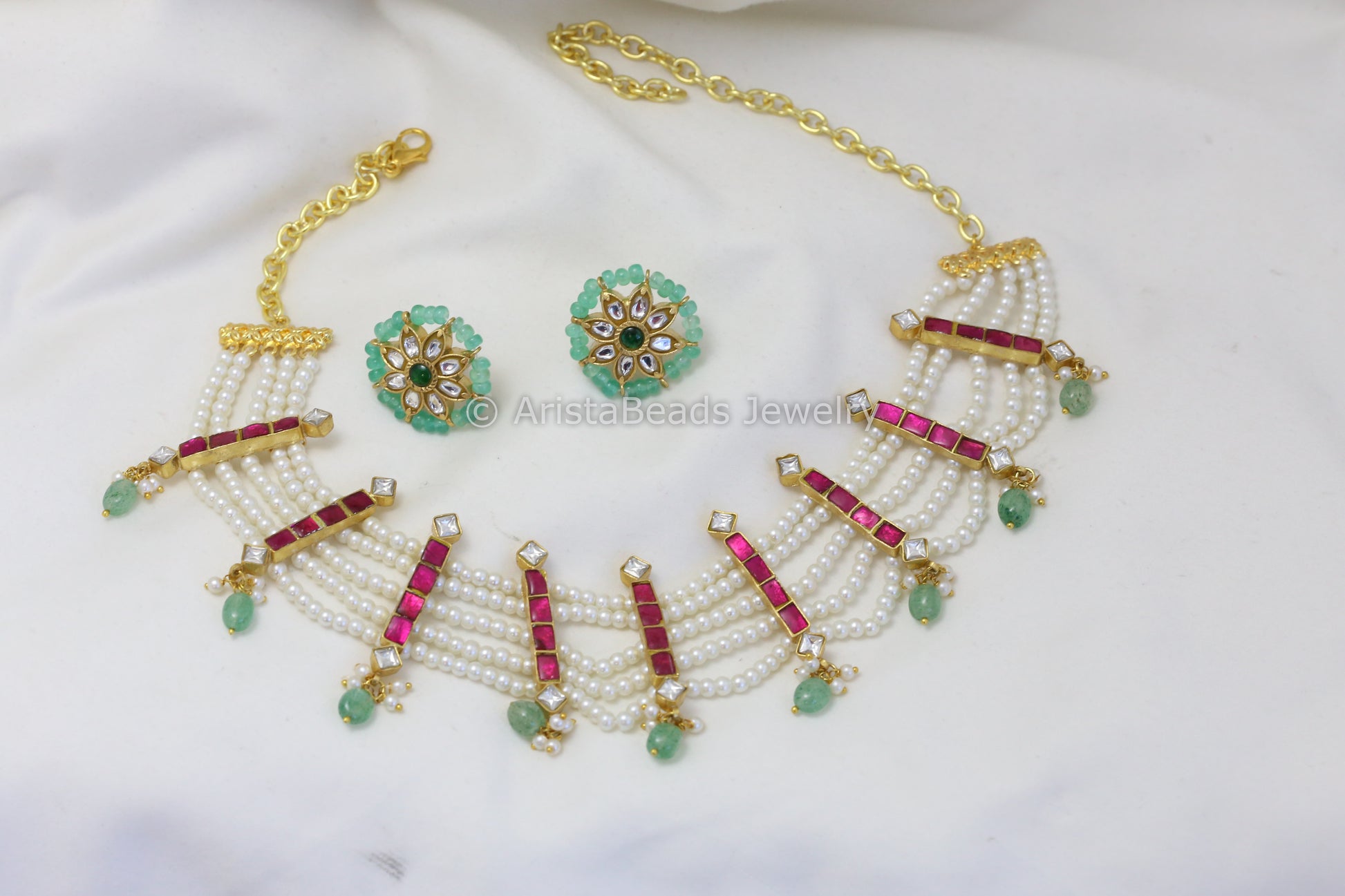 Kundan Jadau Pearl Necklace Set - Ruby Green