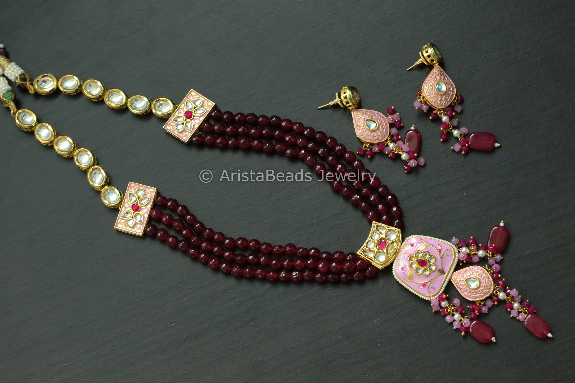 Kundan Meenakari Necklace Set -Pink Red