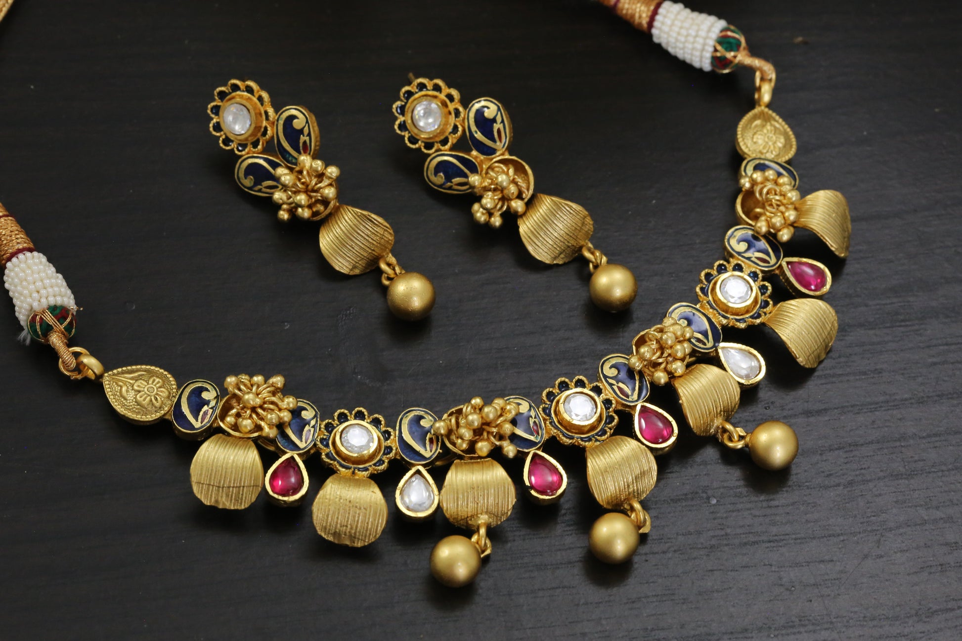 Kundan Polki Enamel Ghungroo Necklace Set - Blue