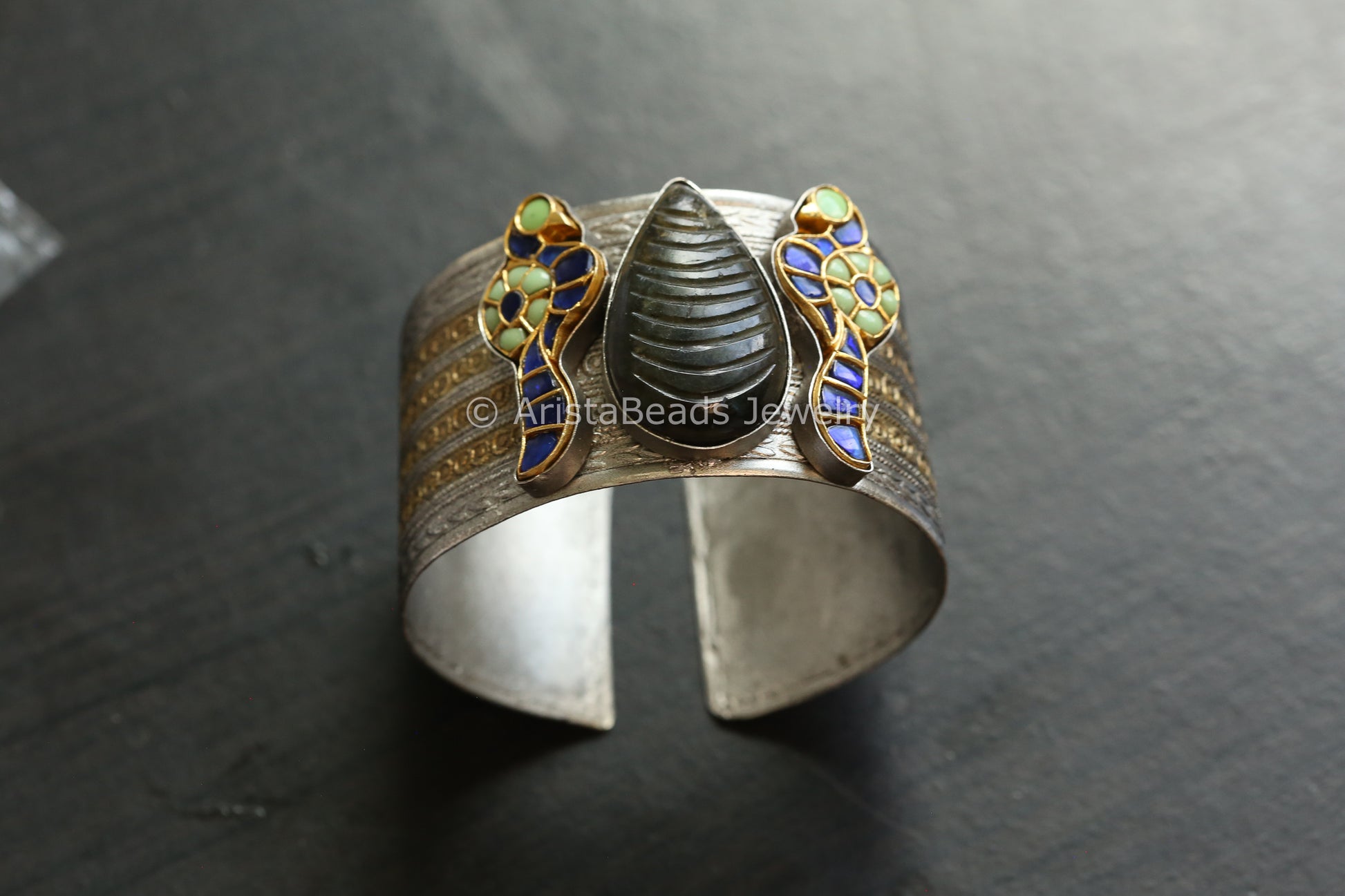 Handmade from natural labradorite, the Labradorite Dual Tone Jadau Fusion Bracelet (ABJ-B101-14) boasts a unique dual tone design. Each bracelet is carved by hand, making it a one-of-a-kind piece. The fusion of traditional and modern jadau techniques create a truly stunning and versatile accessory.