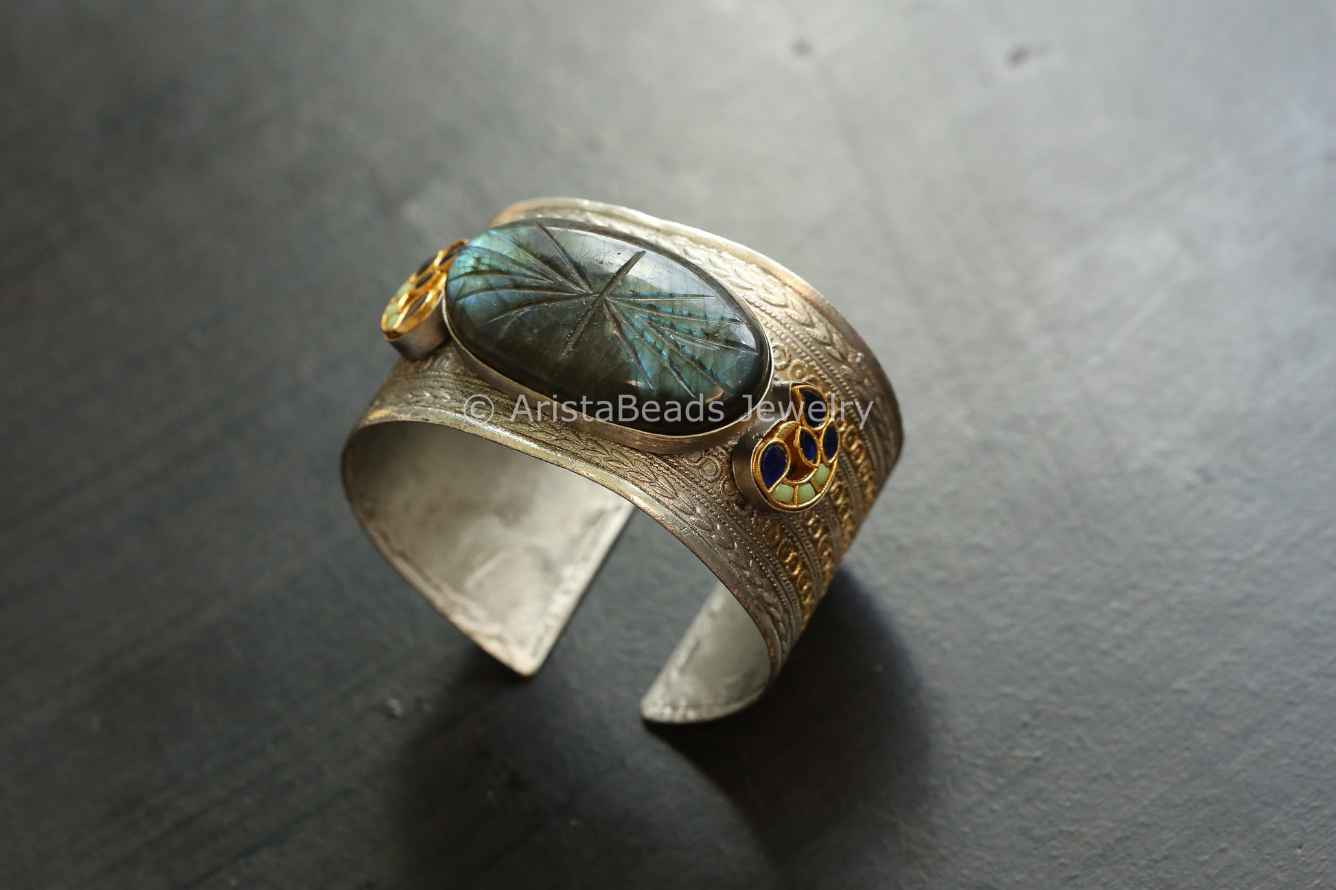 Handmade from natural labradorite, the Labradorite Dual Tone Jadau Fusion Bracelet boasts a unique dual tone design. Each bracelet is carved by hand, making it a one-of-a-kind piece. The fusion of traditional and modern jadau techniques create a truly stunning and versatile accessory.