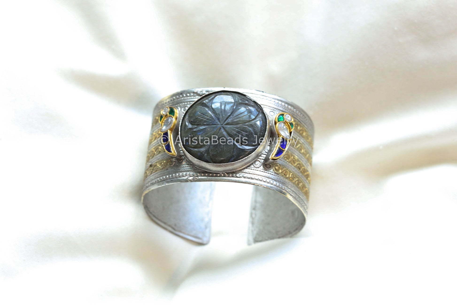 Handmade from natural labradorite, the Labradorite Dual Tone Jadau Fusion Bracelet boasts a unique dual tone design. Each bracelet is carved by hand, making it a one-of-a-kind piece. The fusion of traditional and modern jadau techniques create a truly stunning and versatile accessory.