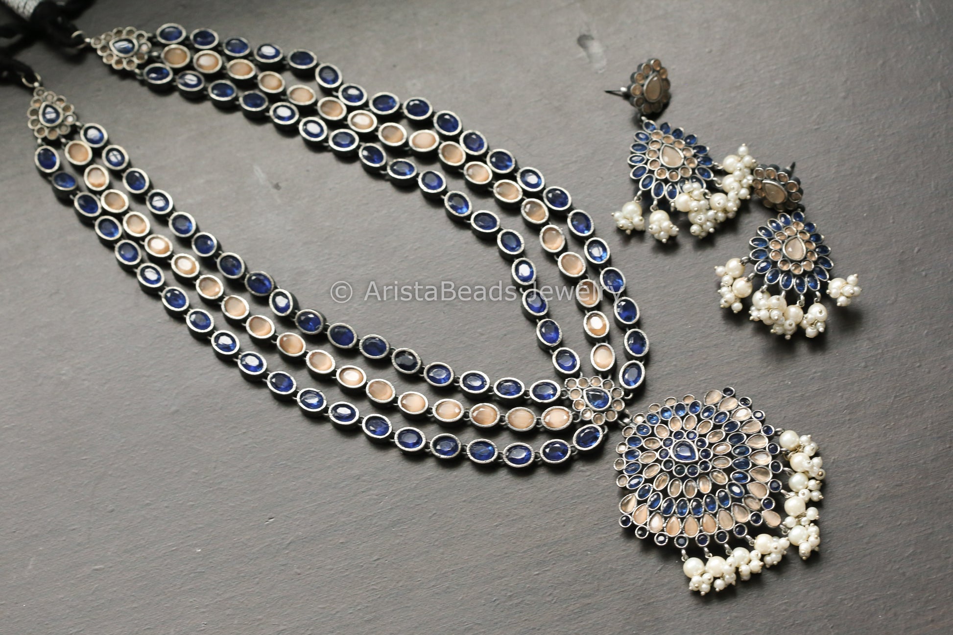 Long Oxidized Peach Blue Necklace Set