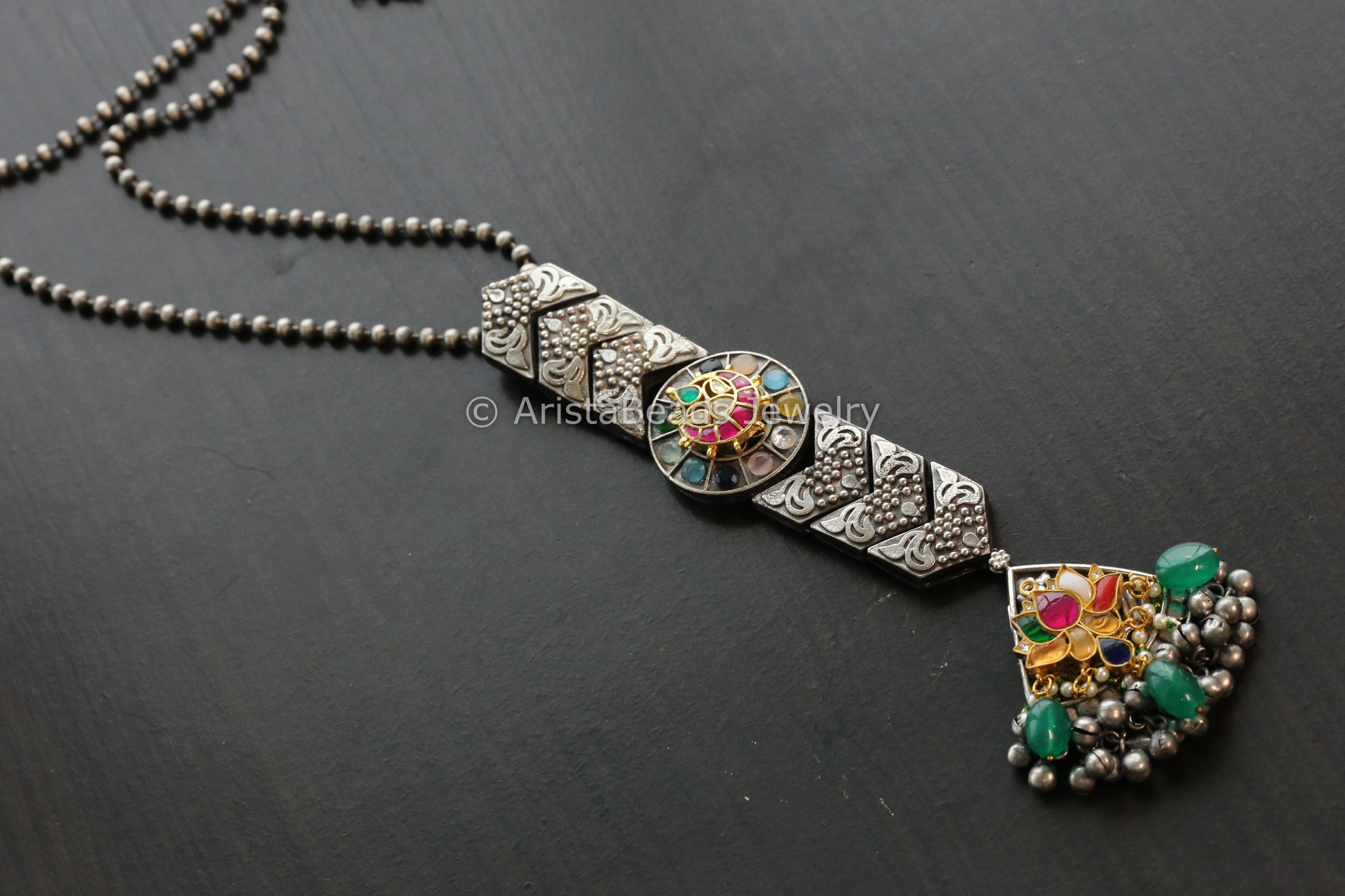 Long Oxidized Pendant Necklace With Kundan Motifs