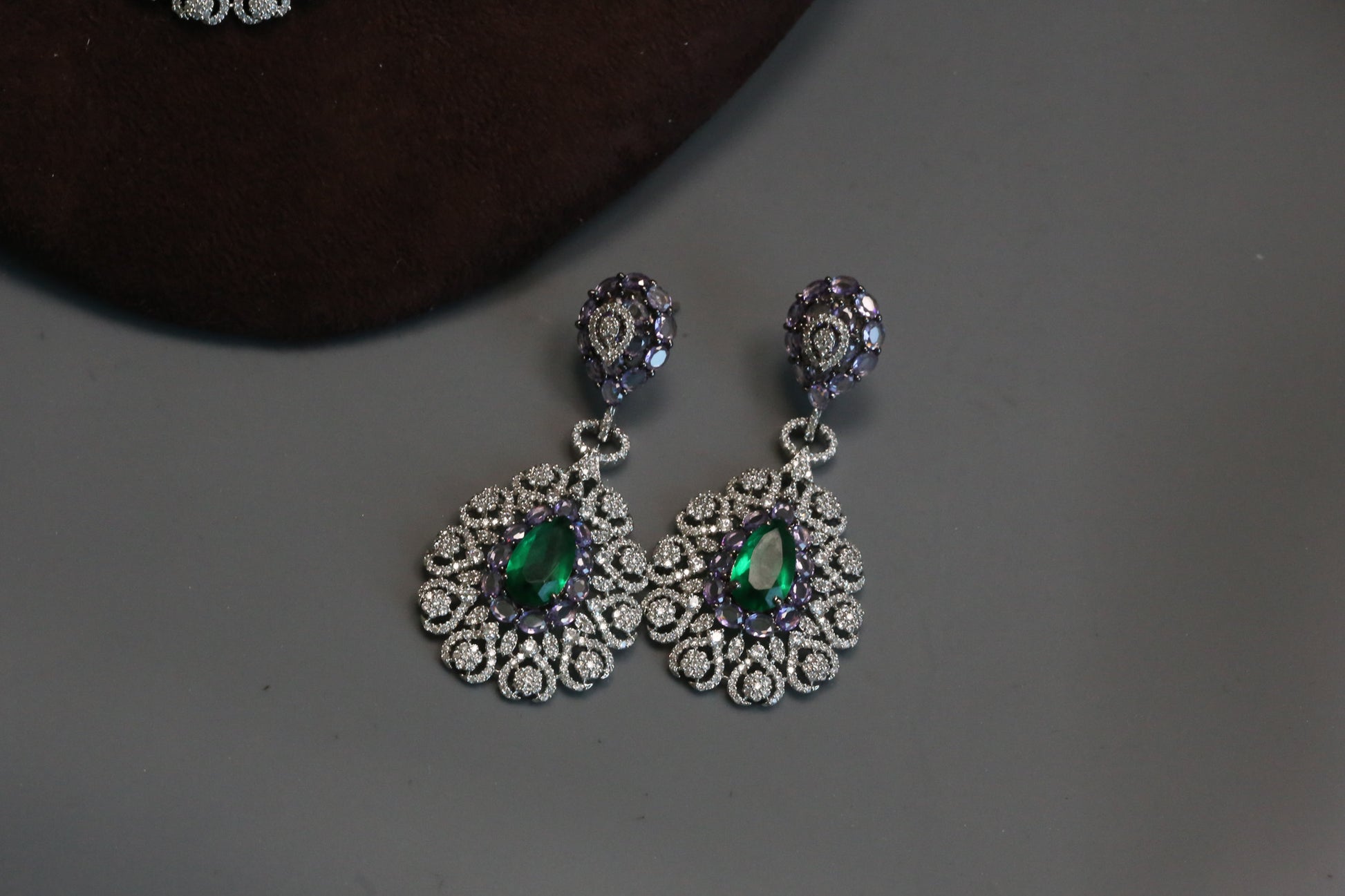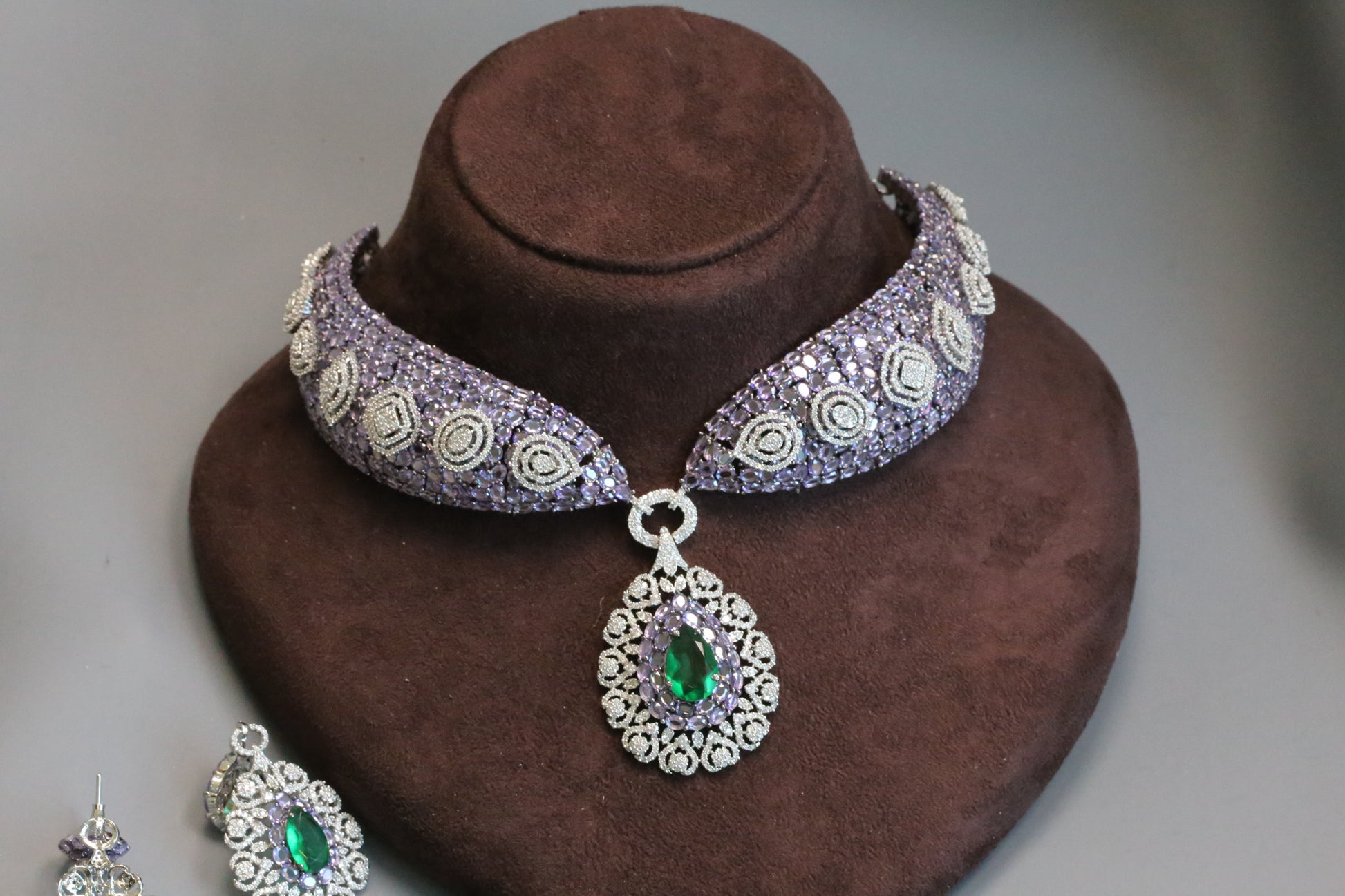 Elevate your style with the Mahira Premium CZ Doublet Necklace Set, featuring a sparkling crystal purple CZ band enhanced by intricate nano CZ detailing for unmatched brilliance.