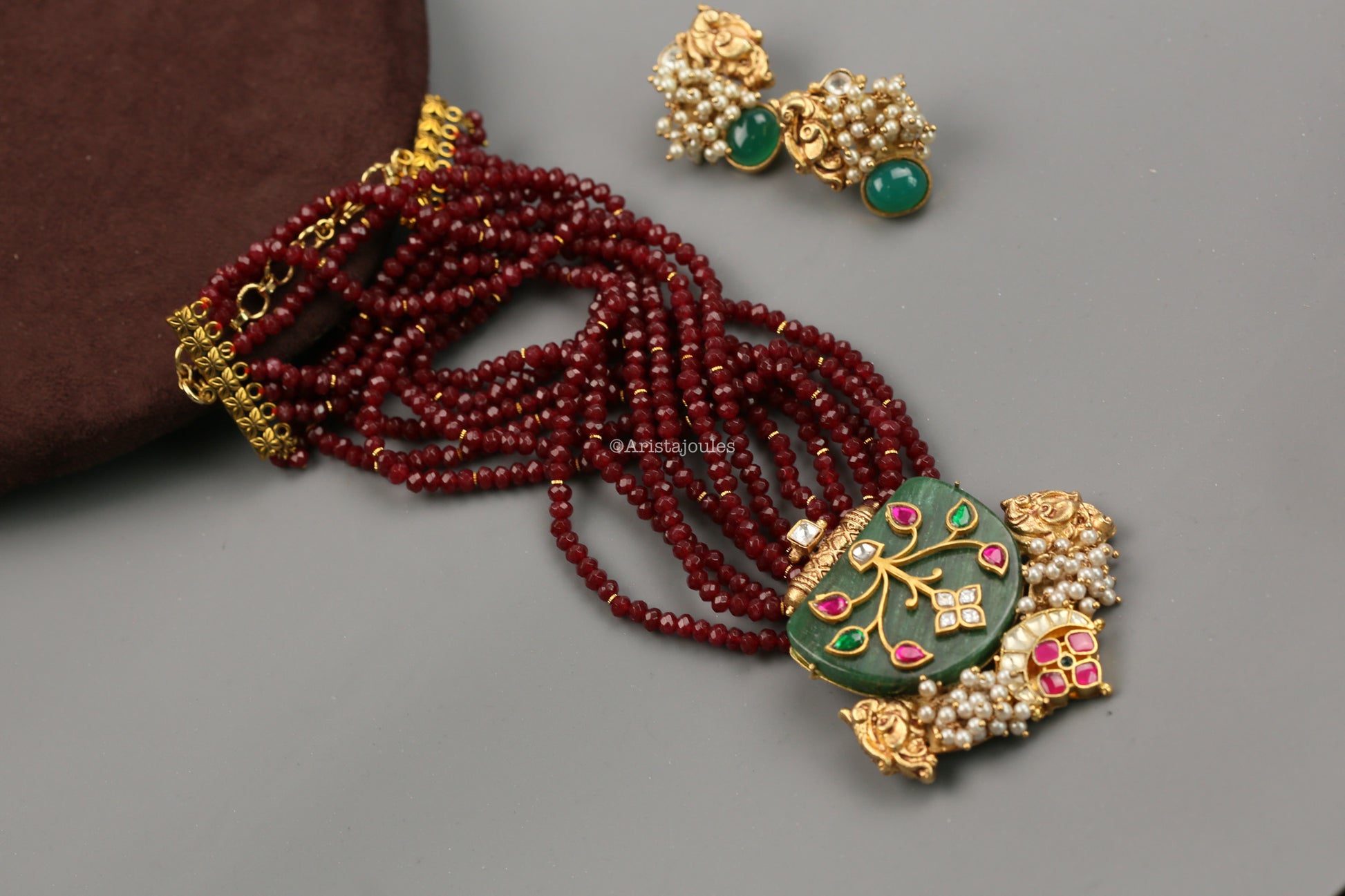 Elevate your jewelry collection with this exquisite Manik Designer Kundan set, where traditional craftsmanship meets contemporary elegance. Featuring intricate inlay work, the set showcases a stunning ruby mala paired with an aventurine pendant, each piece adorned with semiprecious stones in classic kundan style.