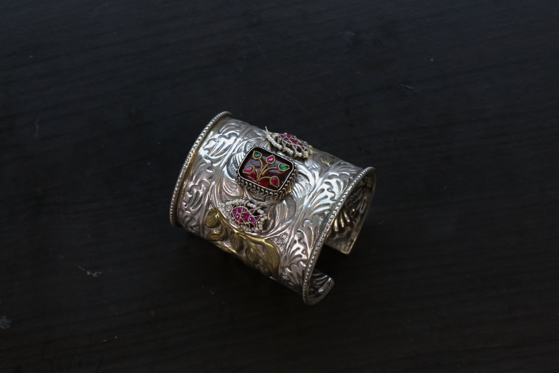 Handmade Dual Tone Jadau Fusion Bracelet boasts a unique dual tone design. Each bracelet is carved by hand, making it a one-of-a-kind piece. The fusion of traditional and modern jadau techniques create a truly stunning and versatile accessory.